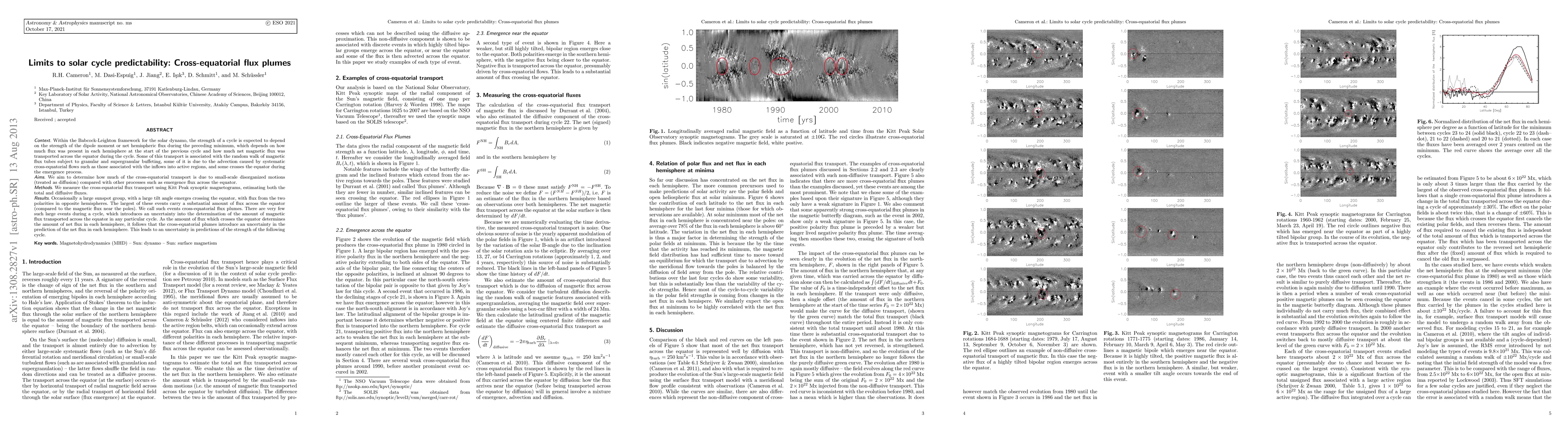 Within the Babcock-Leighton framework for the solar dynamo, the strength of a cycle is expected to depend on the strength of the dipole moment or net hemispheric flux during the preceding minimum, which depends on how much flux was present in each hemisphere at the start of the previous cycle and how much net magnetic flux was transported across the equator during the cycle. Some of this transport is associated with the random walk of magnetic flux tubes subject to granular and supergranular buffeting, some of it is due to the advection caused by systematic cross-equatorial flows such as those associated with the inflows into active regions, and some crosses the equator during the emergence process. We aim to determine how much of the cross-equatorial transport is due to small-scale disorganized motions (treated as diffusion) compared with other processes such as emergence flux across the equator. We measure the cross-equatorial flux transport using Kitt Peak synoptic magnetograms, estimating both the total and diffusive fluxes. Occasionally a large sunspot group, with a large tilt angle emerges crossing the equator, with flux from the two polarities in opposite hemispheres. The largest of these events carry a substantial amount of flux across the equator (compared to the magnetic flux near the poles). We call such events cross-equatorial flux plumes. There are very few such large events during a cycle, which introduces an uncertainty into the determination of the amount of magnetic flux transported across the equator in any particular cycle. As the amount of flux which crosses the equator determines the amount of net flux in each hemisphere, it follows that the cross-equatorial plumes introduce an uncertainty in the prediction of the net flux in each hemisphere. This leads to an uncertainty in predictions of the strength of the following cycle.