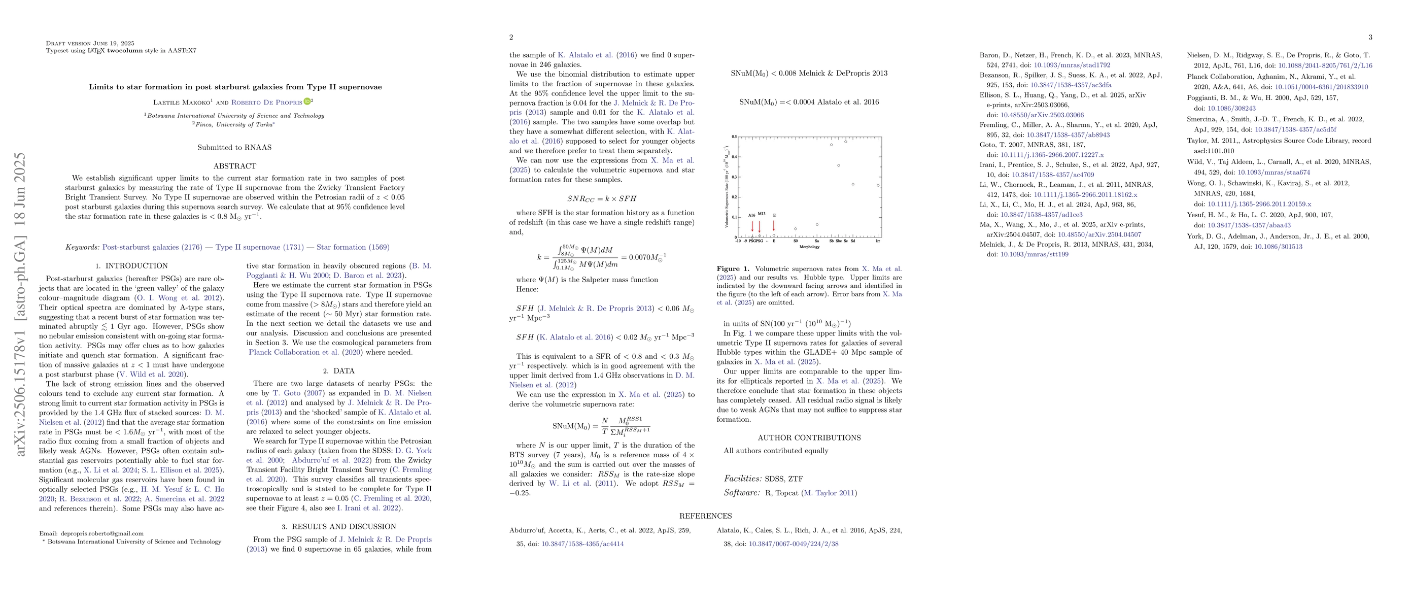 We establish significant upper limits to the current star formation rate in two samples of post starburst galaxies by measuring the rate of Type II supernovae from the Zwicky Transient Factory Bright Transient Survey. No Type II supernovae are observed within the Petrosian radii of $z < 0.05$ post starburst galaxies during this supernova search survey. We calculate that at 95\% confidence level the star formation rate in these galaxies is $< 0.8$ M$_{\odot}$ yr$^{-1}$.
