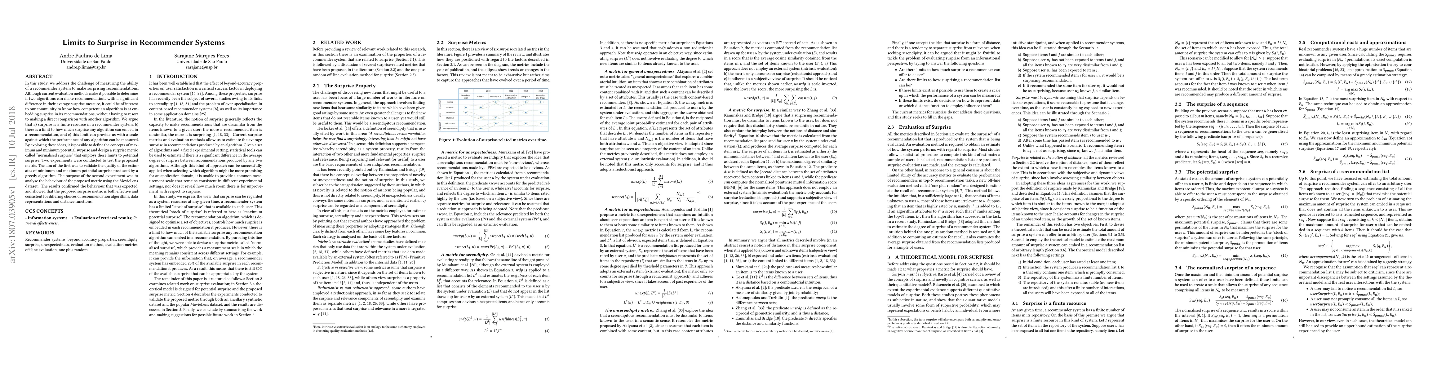 This study proposes a novel metric called "normalised surprise" to measure a recommender system's ability to generate surprising recommendations, arguing that surprise is a finite resource with inherent limits. Experiments validated the metric's effectiveness and consistency across different algorithms and datasets.