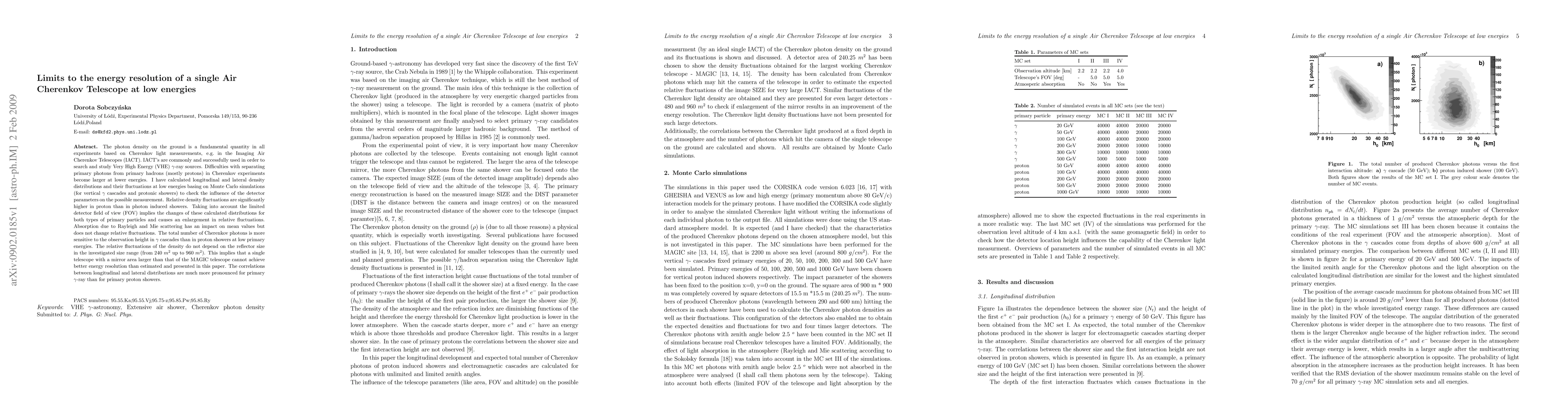 The photon density on the ground is a fundamental quantity in all experiments based on Cherenkov light measurements, e.g. in the Imaging Air Cherenkov Telescopes (IACT). IACT's are commonly and successfully used in order to search and study Very High Energy (VHE) gamma-ray sources. Difficulties with separating primary photons from primary hadrons (mostly protons) in Cherenkov experiments become larger at lower energies. I have calculated longitudinal and lateral density distributions and their fluctuations at low energies basing on Monte Carlo simulations (for vertical gamma cascades and protonic showers) to check the influence of the detector parameters on the possible measurement. Relative density fluctuations are significantly higher in proton than in photon induced showers. Taking into account the limited detector field of view (FOV) implies the changes of these calculated distributions for both types of primary particles and causes an enlargement in relative fluctuations. Absorption due to Rayleigh and Mie scattering has an impact on mean values but does not change relative fluctuations. The total number of Cherenkov photons is more sensitive to the observation height in gamma cascades than in proton showers at low primary energies. The relative fluctuations of the density do not depend on the reflector size in the investigated size range (from 240 m^2 up to 960 m^2). This implies that a single telescope with a mirror area larger than that of the MAGIC telescope cannot achieve better energy resolution than estimated and presented in this paper. The correlations between longitudinal and lateral distributions are much more pronounced for primary gamma-ray than for primary proton showers.