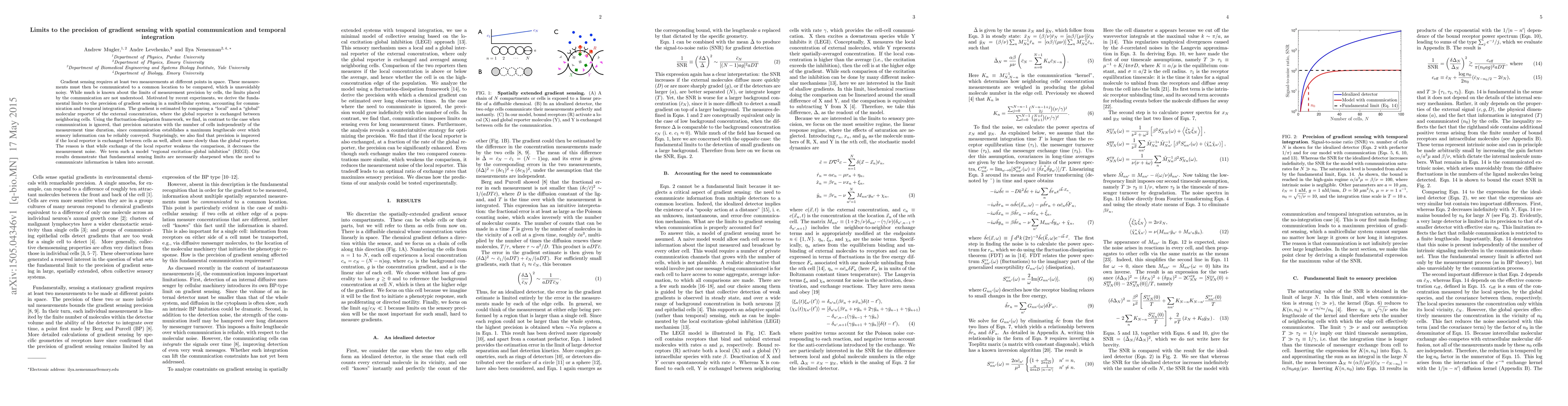 Gradient sensing requires at least two measurements at different points in space. These measurements must then be communicated to a common location to be compared, which is unavoidably noisy. While much is known about the limits of measurement precision by cells, the limits placed by the communication are not understood. Motivated by recent experiments, we derive the fundamental limits to the precision of gradient sensing in a multicellular system, accounting for communication and temporal integration. The gradient is estimated by comparing a "local" and a "global" molecular reporter of the external concentration, where the global reporter is exchanged between neighboring cells. Using the fluctuation-dissipation framework, we find, in contrast to the case when communication is ignored, that precision saturates with the number of cells independently of the measurement time duration, since communication establishes a maximum lengthscale over which sensory information can be reliably conveyed. Surprisingly, we also find that precision is improved if the local reporter is exchanged between cells as well, albeit more slowly than the global reporter. The reason is that while exchange of the local reporter weakens the comparison, it decreases the measurement noise. We term such a model "regional excitation--global inhibition" (REGI). Our results demonstrate that fundamental sensing limits are necessarily sharpened when the need to communicate information is taken into account.