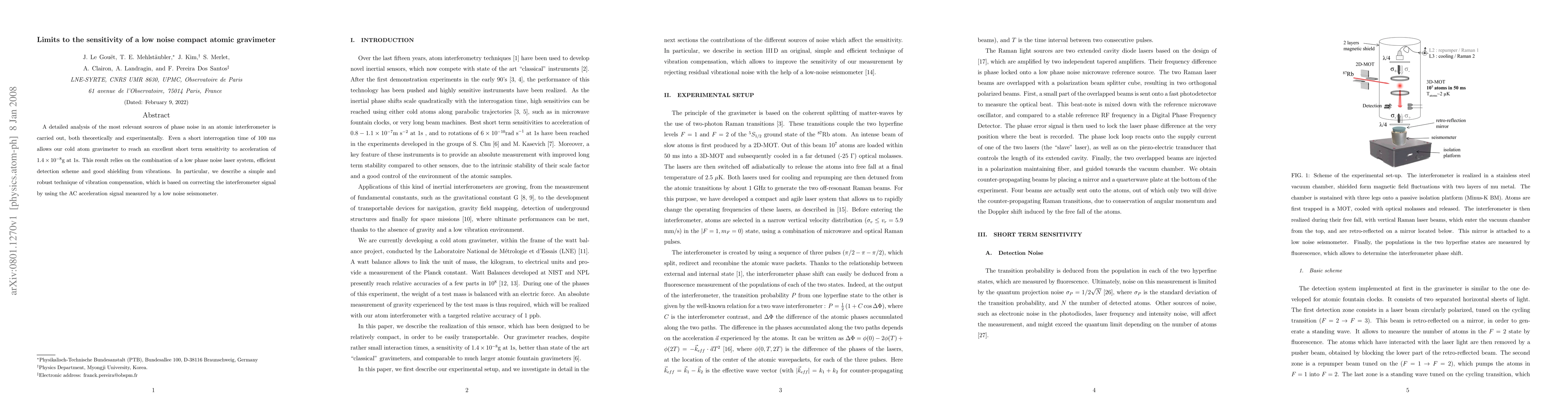 This paper investigates phase noise sources in a low noise atomic gravimeter, achieving high sensitivity acceleration detection of $1.4\times 10^{-8}$g at 1s with a 100 ms interrogation time. The success is attributed to a low phase noise laser, efficient detection, and a robust vibration compensation technique using a low noise seismometer.