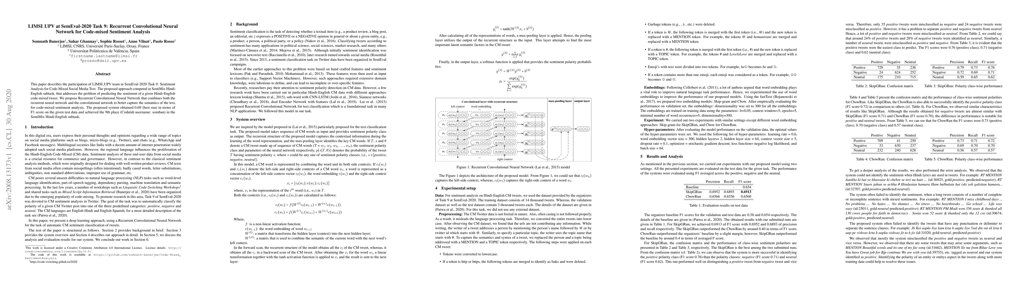 The LIMSI UPV team developed a Recurrent Convolutional Neural Network for code-mixed sentiment analysis in Hindi-English tweets, achieving the 9th place with a best F1 score of 0.69 in SemEval-2020 Task 9. The model combines recurrent and convolutional networks to better capture text semantics.