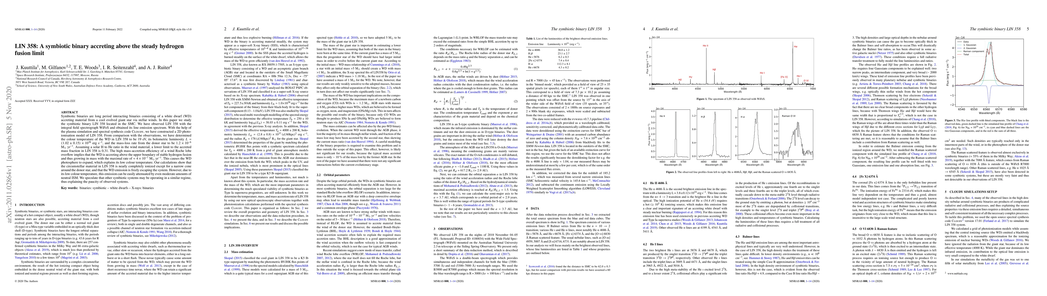 Symbiotic binaries are long period interacting binaries consisting of a white dwarf (WD) accreting material from a cool evolved giant star via stellar winds. In this paper we study the symbiotic binary LIN 358 located in the SMC. We have observed LIN 358 with the integral field spectrograph WiFeS and obtained its line emission spectrum. With the help of the plasma simulation and spectral synthesis code Cloudy, we have constructed a 2D photo-ionisation model of LIN 358. From comparison with the observations, we have determined the colour temperature of the WD in LIN 358 to be 19 eV, its bolometric luminosity $L = (1.02 \pm 0.15) \times 10^{38}$ erg s$^{-1}$, and the mass-loss rate from the donor star to be $ 1.2 \times 10^{-6}$ M$_{\odot}$ yr$^{-1}$. Assuming a solar H to He ratio in the wind material, a lower limit to the accreted mass fraction in LIN 358 is 0.31. The high mass-accretion efficiency of a wind Roche lobe overflow implies that the WD is accreting above the upper boundary of stable hydrogen fusion and thus growing in mass with the maximal rate of $\approx 4 \times 10^{-7}$ M$_{\odot}$ yr$^{-1}$. This causes the WD photosphere to expand, which explains its low colour temperature. Our calculations show that the circumstellar material in LIN 358 is nearly completely ionized except for a narrow cone around the donor star, and that the WD emission is freely escaping the system. However, due to its low colour temperature, this emission can be easily attenuated by even moderate amounts of neutral ISM. We speculate that other symbiotic systems may be operating in a similar regime, thus explaining the paucity of observed systems.