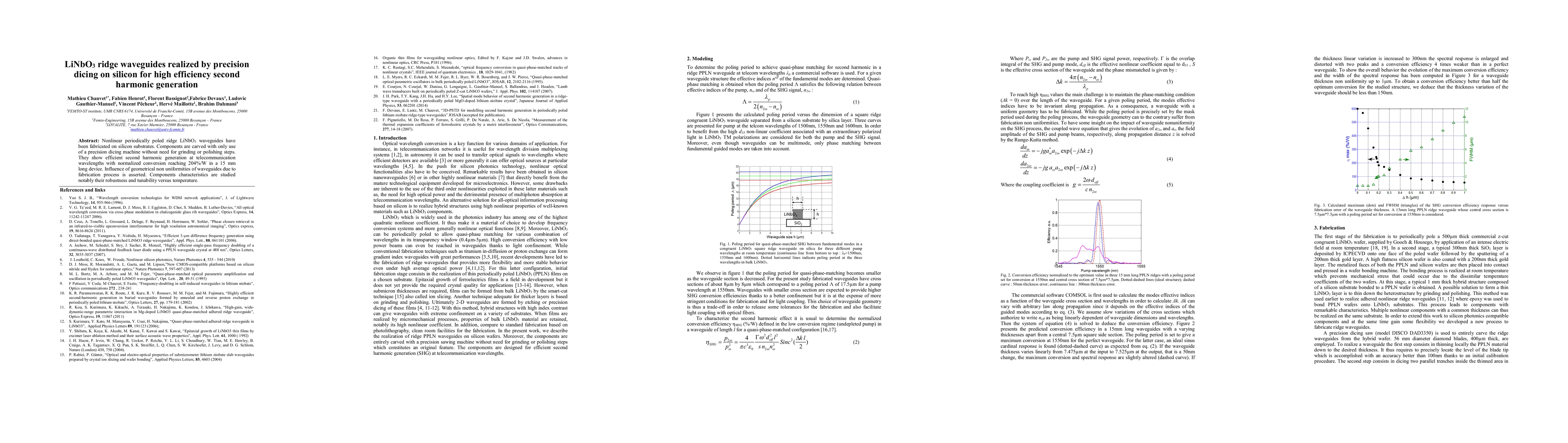 Researchers developed efficient second harmonic generation using LiNbO3 ridge waveguides on silicon substrates, achieving 204%/W conversion efficiency in a 15 mm long device.
