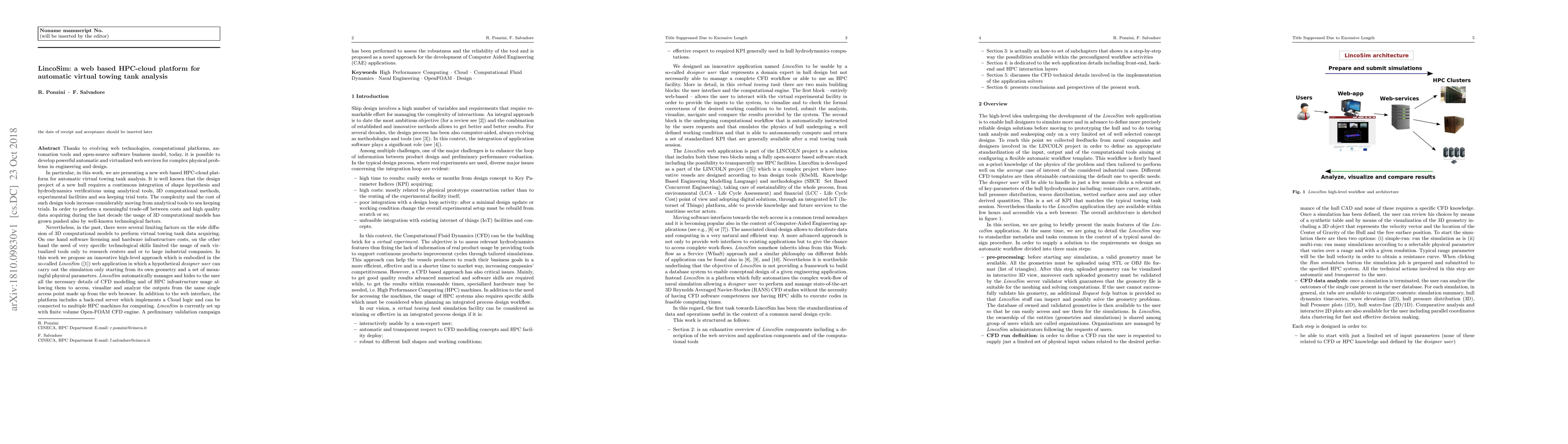 LincoSim is a web-based HPC-cloud platform designed for automatic virtual towing tank analysis, simplifying the integration of 3D computational models for hull design. It abstracts complex CFD modeling and HPC infrastructure, enabling users to visualize and analyze simulation outputs directly through a web browser, thus reducing costs and technical barriers.