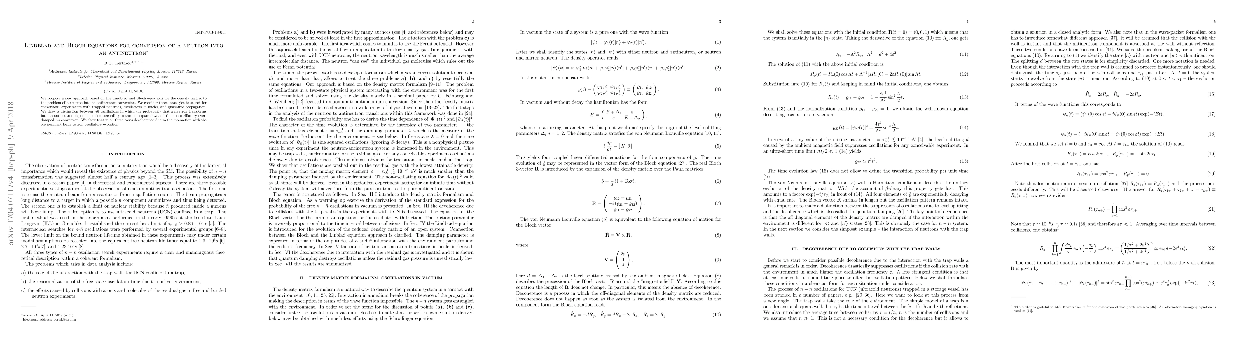 This paper proposes a novel approach using Lindblad and Bloch equations for the density matrix to study neutron-antineutron conversion, exploring three strategies: trapped neutron experiments, nuclear oscillations, and quasi-free propagation. It distinguishes between oscillatory and non-oscillatory conversion processes, demonstrating that environmental interactions cause non-oscillatory evolution in all cases.