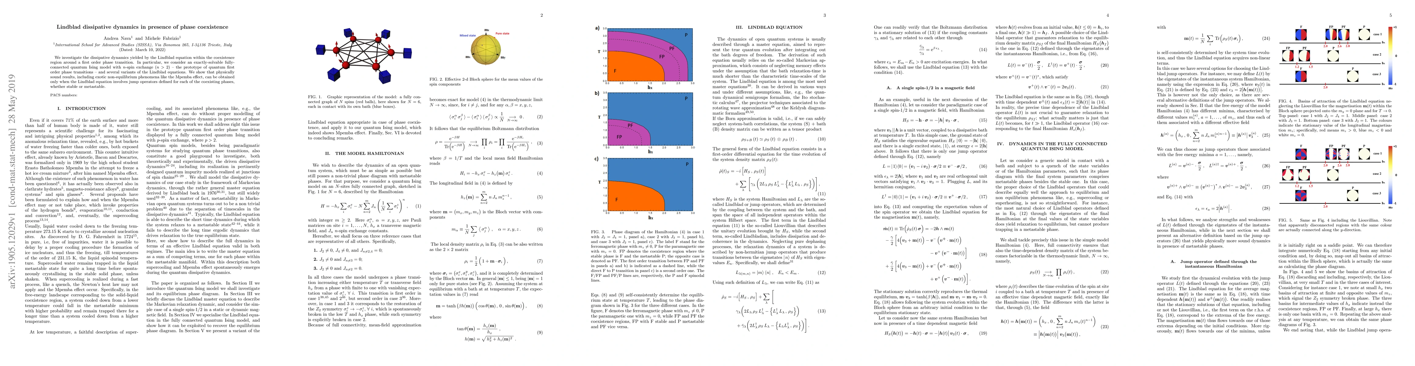 We investigate the dissipative dynamics yielded by the Lindblad equation within the coexistence region around a first order phase transition. In particular, we consider an exactly-solvable fullyconnected quantum Ising model with n-spin exchange (n > 2) - the prototype of quantum first order phase transitions - and several variants of the Lindblad equations. We show that physically sound results, including exotic non-equilibrium phenomena like the Mpemba effect, can be obtained only when the Lindblad equation involves jump operators defined for each of the coexisting phases, whether stable or metastable.