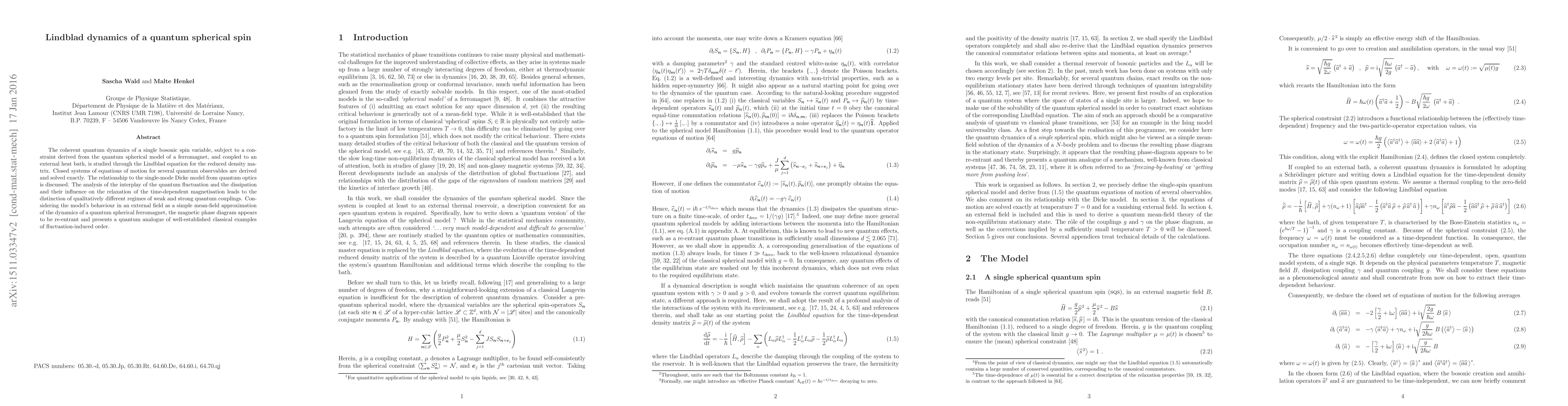 The coherent quantum dynamics of a single bosonic spin variable, subject to a constraint derived from the quantum spherical model of a ferromagnet, and coupled to an external heat bath, is studied through the Lindblad equation for the reduced density matrix. Closed systems of equations of motion for several quantum observables are derived and solved exactly. The relationship to the single-mode Dicke model from quantum optics is discussed. The analysis of the interplay of the quantum fluctuation and the dissipation and their influence on the relaxation of the time-dependent magnetisation leads to the distinction of qualitatively different regimes of weak and strong quantum couplings. Considering the model's behaviour in an external field as a simple mean-field approximation of the dynamics of a quantum spherical ferromagnet, the magnetic phase diagramme appears to be re-entrant and presents a quantum analogue of well-established classical examples of fluctuation-induced order.