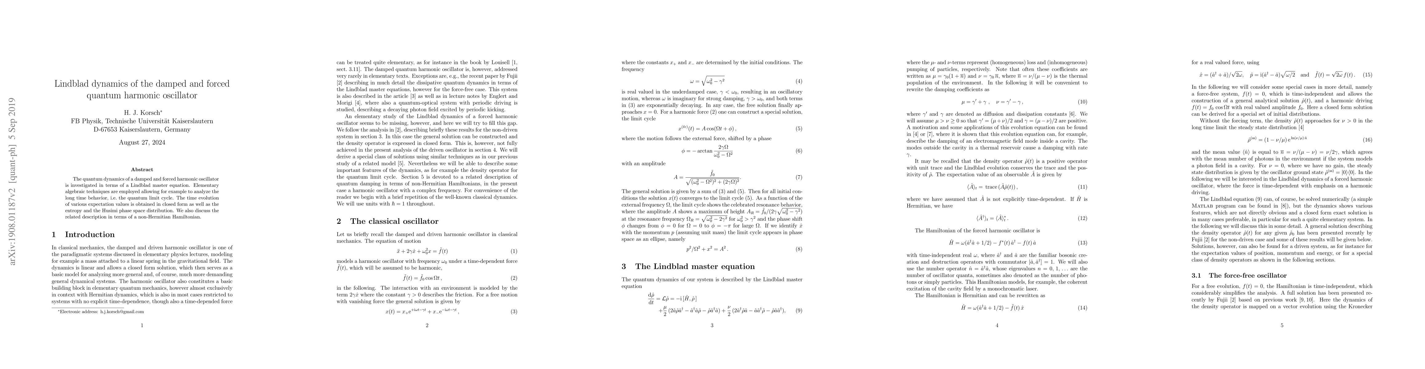 This paper investigates the quantum dynamics of a damped and forced harmonic oscillator using a Lindblad master equation, deriving closed-form solutions for long-time behavior, expectation values, entropy, and the Husimi phase space distribution, and also explores the system's description via a non-Hermitian Hamiltonian.