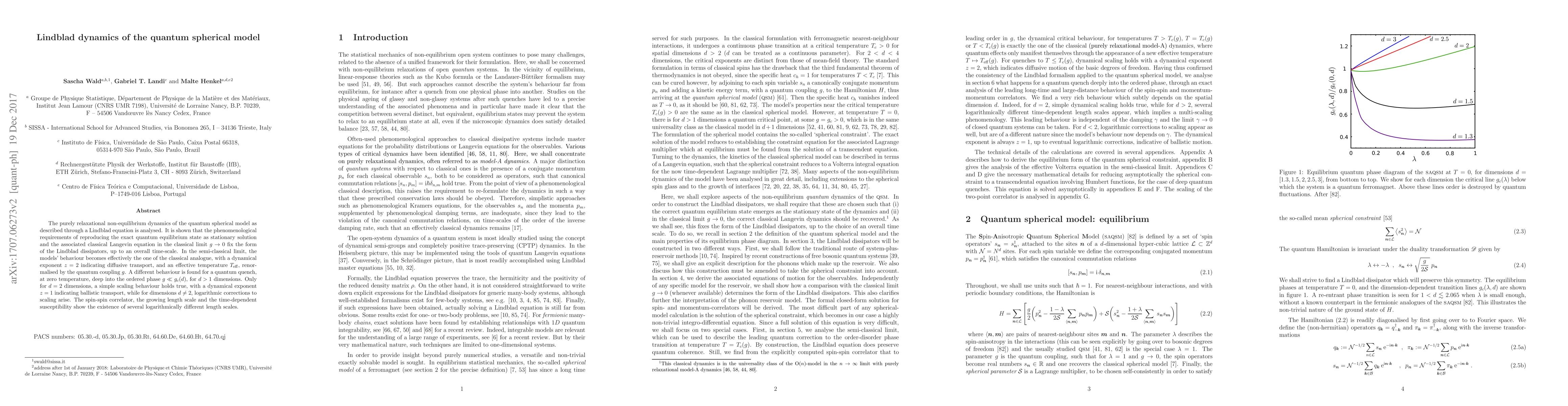 The purely relaxational non-equilibrium dynamics of the quantum spherical model as described through a Lindblad equation is analysed. It is shown that the phenomenological requirements of reproducing the exact quantum equilibrium state as stationary solution and the associated classical Langevin equation in the classical limit $g\to 0$ fix the form of the Lindblad dissipators, up to an overall time-scale. In the semi-classical limit, the models' behaviour become effectively the one of the classical analogue, with a dynamical exponent $z=2$, and an effective temperature $T_{\rm eff}$, renormalised by the quantum coupling $g$. A distinctive behaviour is found for a quantum quench, at zero temperature, deep into the ordered phase $g\ll g_c(d)$, for $d>1$ dimensions. Only for $d=2$ dimensions, a simple scaling behaviour holds true, with a dynamical exponent $z=1$, while for dimensions $d\ne 2$, logarithmic corrections to scaling arise. The spin-spin correlator, the growing length scale and the time-dependent susceptibility show the existence of several logarithmically different length scales.