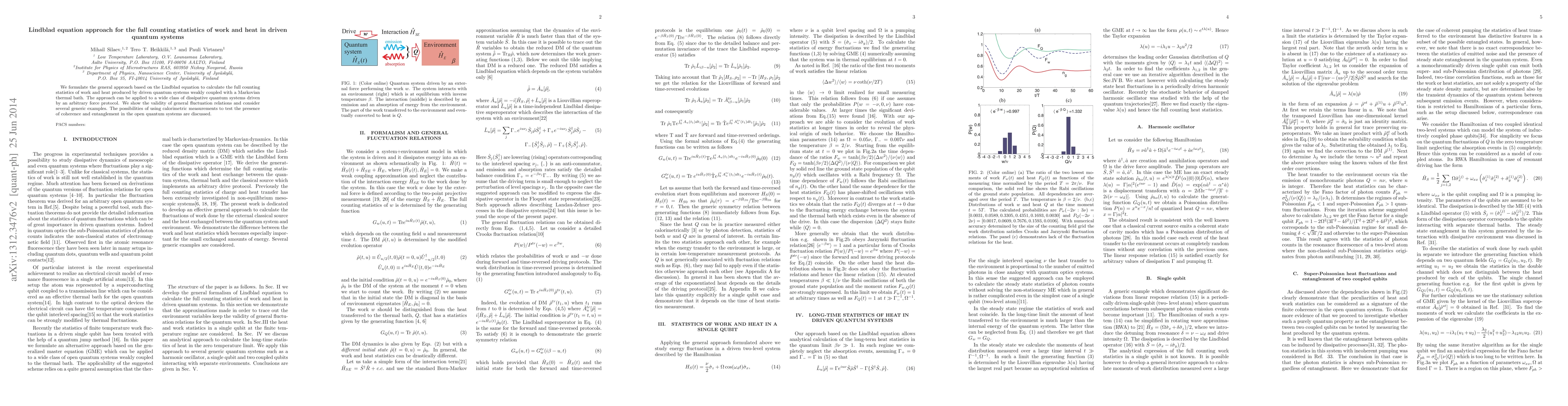 This paper develops a Lindblad equation-based method to calculate the full counting statistics of work and heat in driven quantum systems weakly coupled to a thermal bath. It demonstrates the applicability to various dissipative quantum systems and discusses using calorimetry to detect coherence and entanglement.