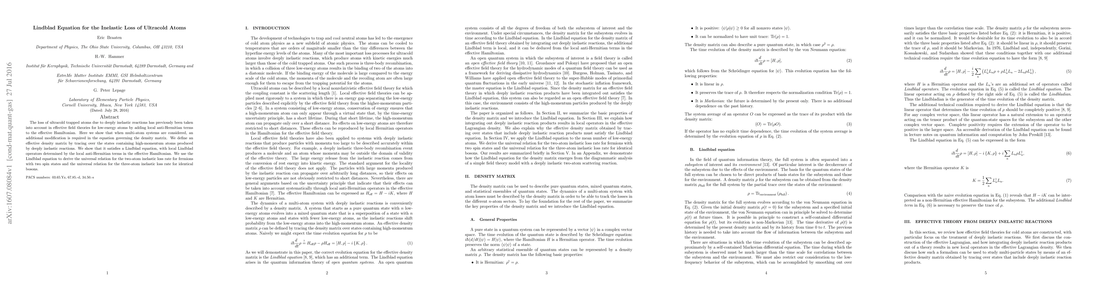 This paper proposes a modified Lindblad equation to account for the inelastic loss of ultracold atoms in multi-atom systems, deriving universal relations for the inelastic loss rates of fermions and bosons. The approach involves defining an effective density matrix and determining local Lindblad operators from the effective Hamiltonian.