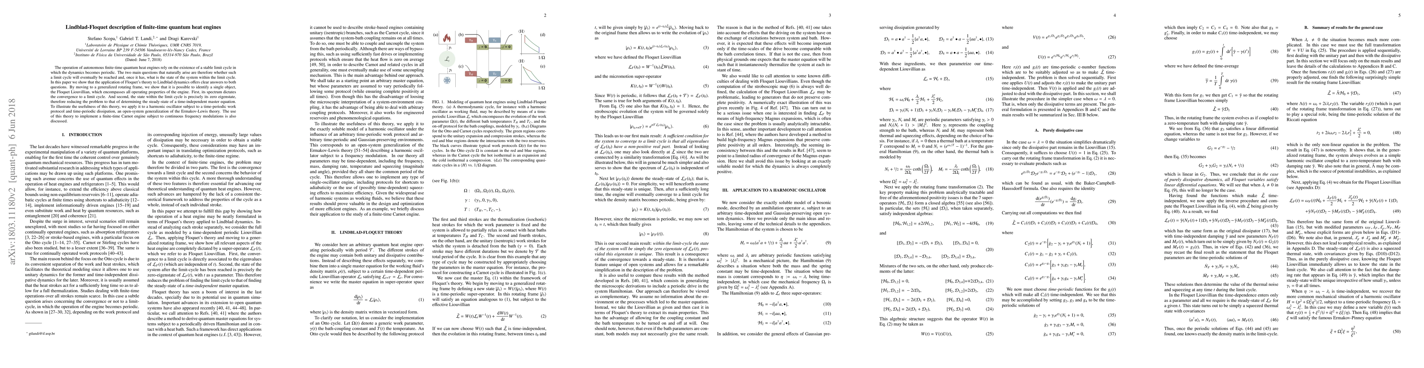The operation of autonomous finite-time quantum heat engines rely on the existence of a stable limit cycle in which the dynamics becomes periodic. The two main questions that naturally arise are therefore whether such a limit cycle will eventually be reached and, once it has, what is the state of the system within the limit cycle. In this paper we show that the application of Floquet's theory to Lindblad dynamics offers clear answers to both questions. By moving to a generalized rotating frame, we show that it is possible to identify a single object, the Floquet Liouvillian, which encompasses all operating properties of the engine. First, its spectrum dictates the convergence to a limit cycle. And second, the state within the limit cycle is precisely its zero eigenstate, therefore reducing the problem to that of determining the steady-state of a time-independent master equation. To illustrate the usefulness of this theory, we apply it to a harmonic oscillator subject to a time-periodic work protocol and time-periodic dissipation, an open-system generalization of the Ermakov-Lewis theory. The use of this theory to implement a finite-time Carnot engine subject to continuous frequency modulations is also discussed.