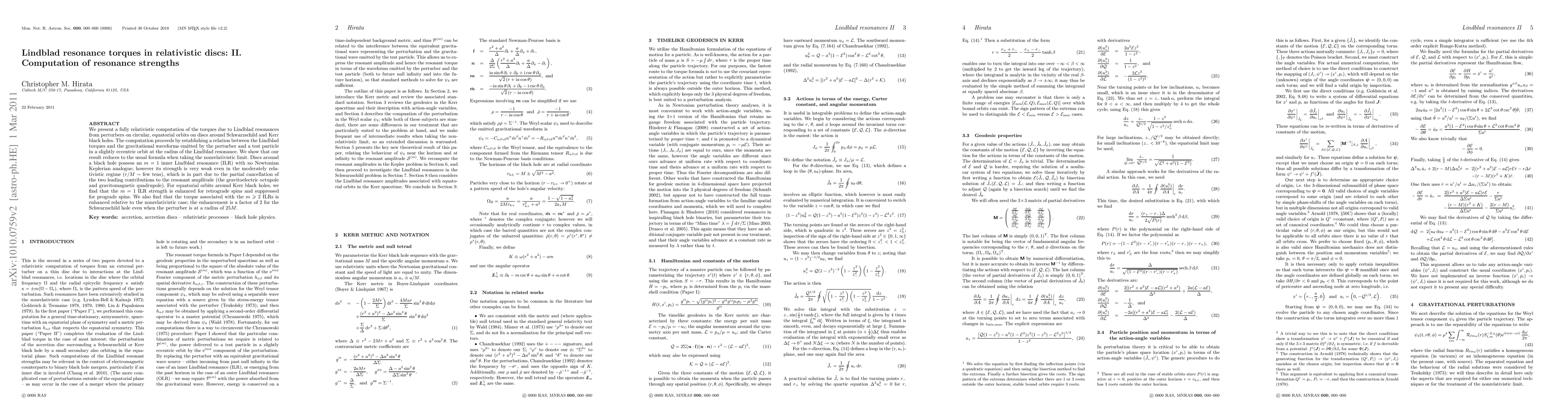 We present a fully relativistic computation of the torques due to Lindblad resonances from perturbers on circular, equatorial orbits on discs around Schwarzschild and Kerr black holes. The computation proceeds by establishing a relation between the Lindblad torques and the gravitational waveforms emitted by the perturber and a test particle in a slightly eccentric orbit at the radius of the Lindblad resonance. We show that our result reduces to the usual formula when taking the nonrelativistic limit. Discs around a black hole possess an m=1 inner Lindblad resonance with no Newtonian Keplerian analogue; however its strength is very weak even in the moderately relativistic regime (r/M ~ few tens), which is in part due to the partial cancellation of the two leading contributions to the resonant amplitude (the gravitoelectric octupole and gravitomagnetic quadrupole). For equatorial orbits around Kerr black holes, we find that the m=1 ILR strength is enhanced for retrograde spins and suppressed for prograde spins. We also find that the torque associated with the m>=2 inner Lindblad resonances is enhanced relative to the nonrelativistic case; the enhancement is a factor of 2 for the Schwarzschild hole even when the perturber is at a radius of 25M.