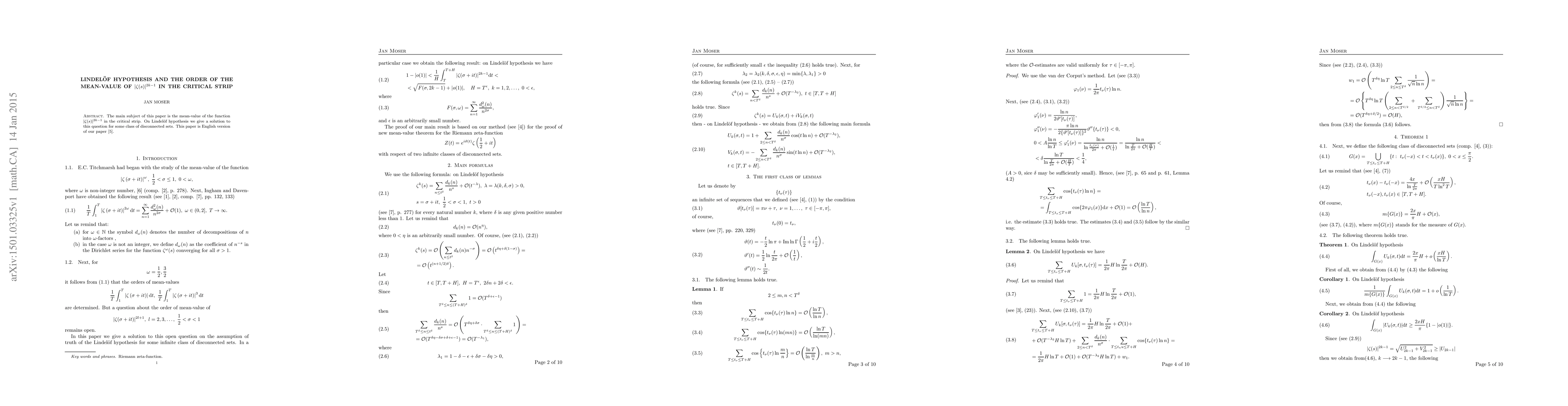 The main subject of this paper is the mean-value of the function $|\zeta(s)|^{2k-1}$ in the critical strip. On Lindel\" of hypothesis we give a solution to this question for some class of disconnected sets. This paper is English version of our paper \cite{5}.
