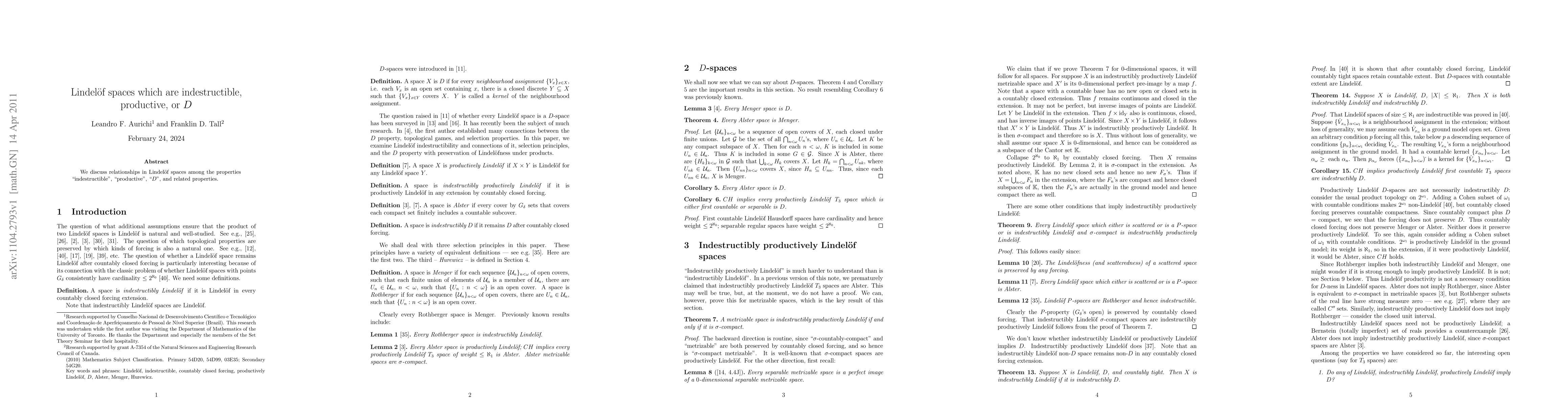 Summary: This paper explores the interconnections between the properties of indestructibility, productivity, and D in Lindelof spaces, analyzing how these characteristics relate to each other within this topological framework.