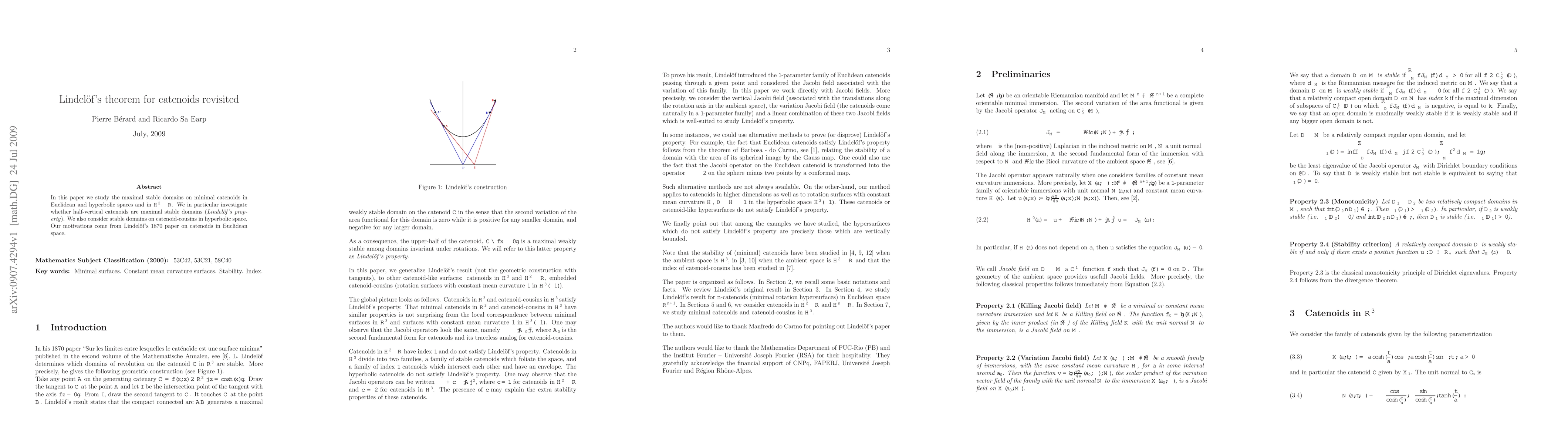 This paper explores maximal stable domains on minimal catenoids in Euclidean, hyperbolic, and $H^2 \times R$ spaces, investigating if half-vertical catenoids exhibit Lindel\"of's property. It also examines stable domains on related catenoid structures in hyperbolic space, inspired by Lindel\"of's 1870 work on Euclidean catenoids.