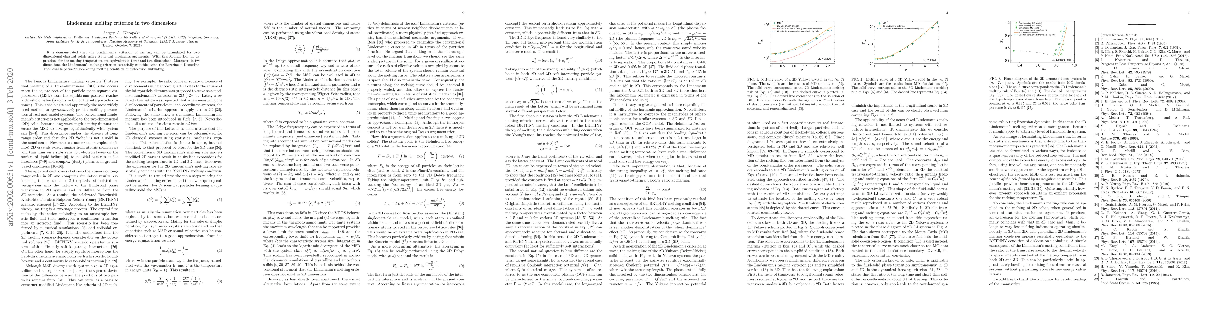 This paper formulates Lindemann's melting criterion for two-dimensional classical solids using statistical mechanics, showing that the melting temperature expressions are equivalent in two and three dimensions. It also reveals that the Lindemann criterion aligns with the Berezinskii-Kosterlitz-Thouless-Halperin-Nelson-Young condition for dislocation unbinding in two dimensions.