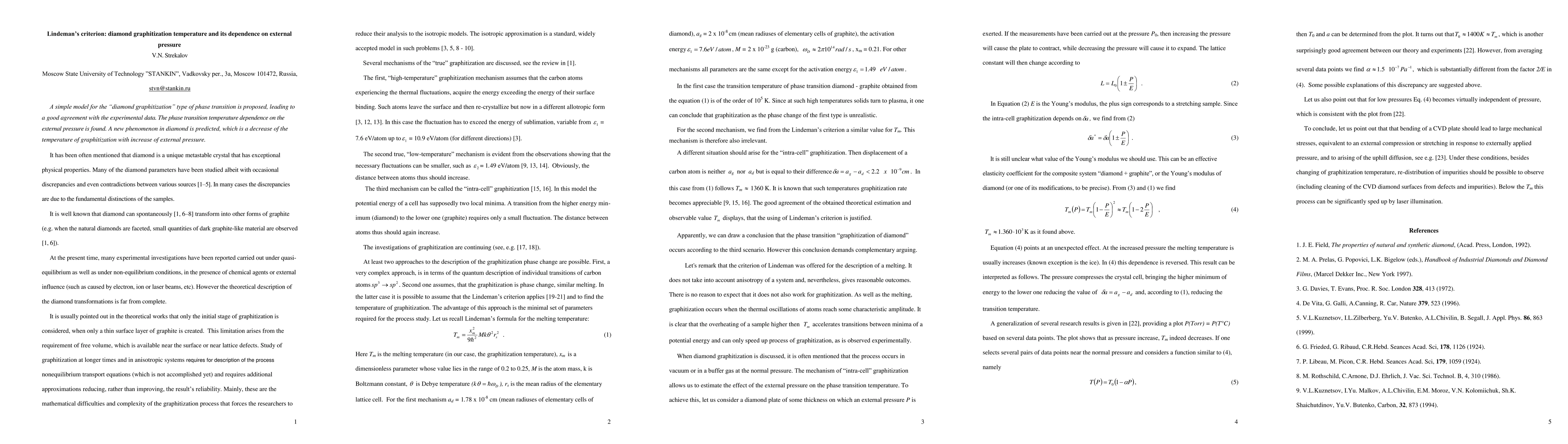 Summary: This paper proposes a model explaining the "diamond graphitization" phase transition, showing good experimental agreement. It reveals a novel finding that the temperature for this transition decreases with increasing external pressure.