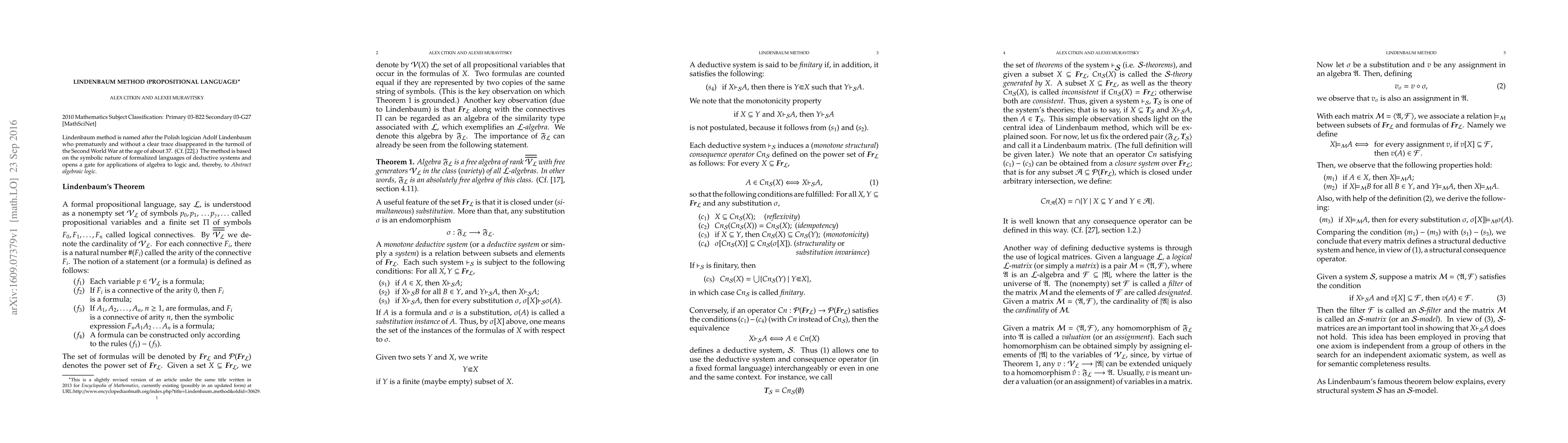 Summary: The Lindenbaum method, developed by Adolf Lindenbaum, utilizes the symbolic structure of formalized languages to apply algebraic principles to logic, forming a bridge to Abstract algebraic logic. Lindenbaum's life was cut short during World War II, but his method remains influential in the field.
