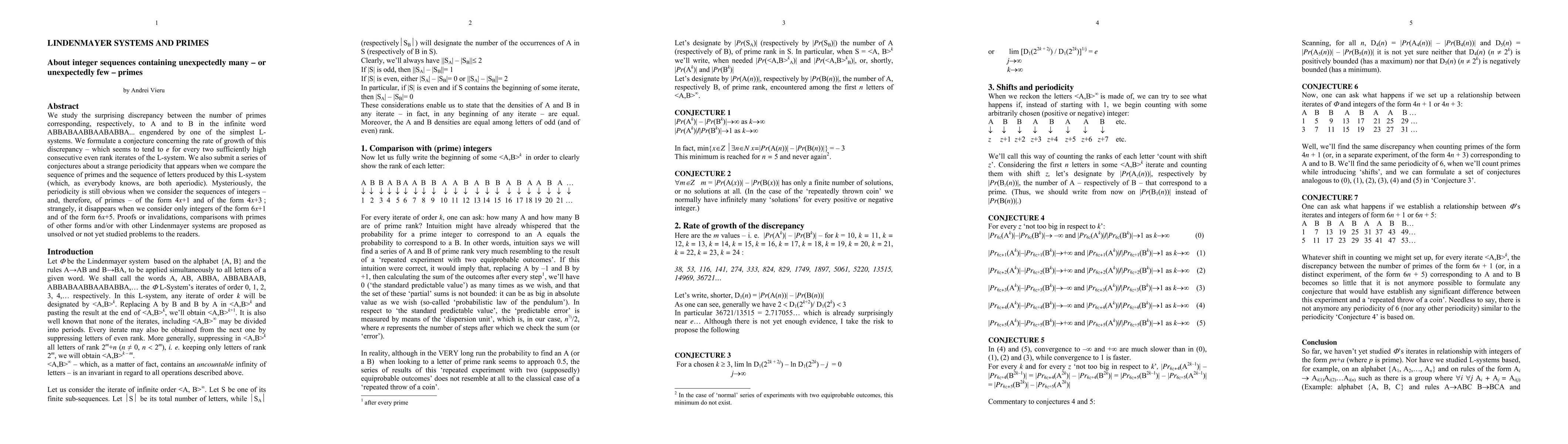 This paper investigates the relationship between Lindenmayer systems and prime numbers, focusing on the difference in the number of primes associated with the two letters of an infinite word generated by such a system. The authors propose a conjecture about the rate of growth of this discrepancy, suggesting it tends towards the value e for high consecutive even rank iterates.