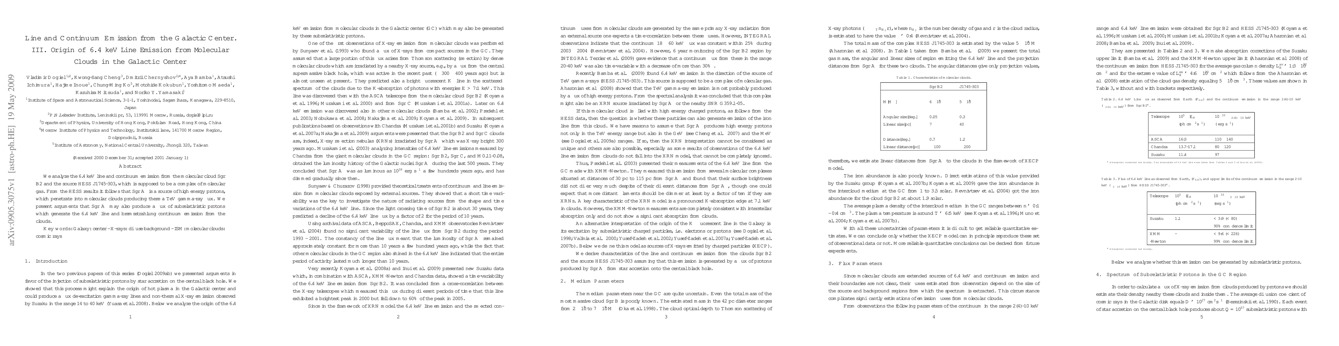 This paper investigates the origin of the 6.4 keV line emission from the molecular clouds Sgr B2 and HESS J1745-303 in the Galactic Center, suggesting that high-energy protons from Sgr A produce subrelativistic protons that generate this line and continuum emission. The findings imply a connection between Sgr A's high-energy proton flux and the observed 6.4 keV line.