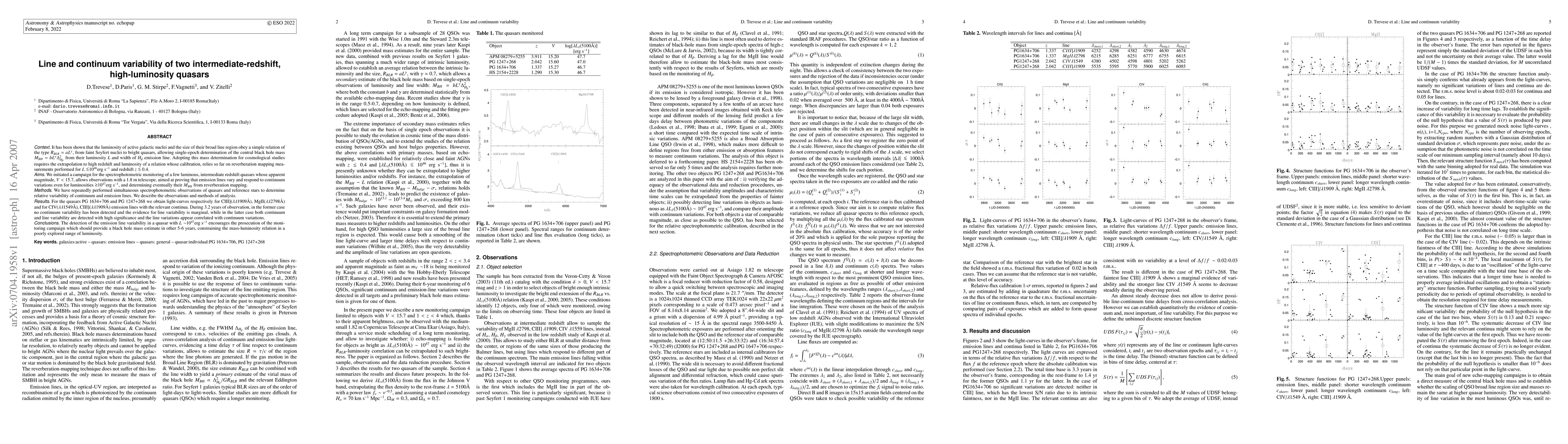 It has been shown that the luminosity of AGNs and the size of their broad line region obey a simple relation of the type R=a L^g, from faint Seyfert nuclei to bright quasars, allowing single-epoch determination of the central black hole mass M=b L^g D^2 from their luminosity L and width of H_beta emission line. Adopting this mass determination for cosmological studies requires the extrapolation to high z and L of a relation whose calibration relies so far on reverberation mapping measurements performed for L<10^46 erg/s and z<0.4. We initiated a campaign for the monitoring of a few luminous, intermediate z quasars whose apparent magnitude V<15.7 allows observations with a 1.8m telescope, aimed at proving that emission lines vary and respond to continuum variations even for luminosities >10^47 erg/s, and determining eventually their M_BH from reverberation mapping. We have repeatedly performed simultaneous observations of quasars and reference stars to determine relative variability of continuum and emission lines. We describe the observations and methods of analysis. For the quasars PG1634+706 and PG1247+268 we obtain light-curves respectively for CIII], MgII and for CIV, CIII] emission lines with the relevant continua. During 3.2 years of observation, in the former case no continuum variability has been detected and the evidence for line variability is marginal, while in the latter case both continuum and line variability are detected with high significance and the line variations appear correlated with continuum variations. The detection of the emission line variability in a quasar with L~10^47 erg/s encourages the prosecution of the campaign which should provide a black hole mass estimate in other 5-6 years, constraining the M_BH-L relation in a poorly explored range of luminosity.