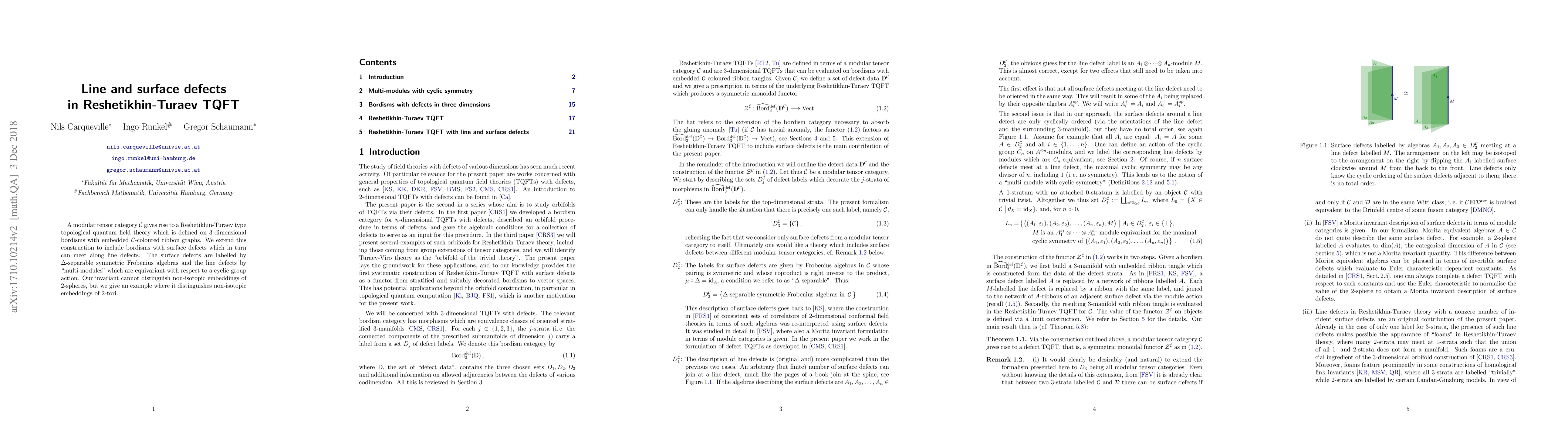 This paper extends the Reshetikhin-Turaev topological quantum field theory to include bordisms with surface and line defects, labelled by symmetric Frobenius algebras and multi-modules, respectively. While the invariant cannot distinguish non-isotopic embeddings of 2-spheres, it can differentiate non-isotopic embeddings of 2-tori.