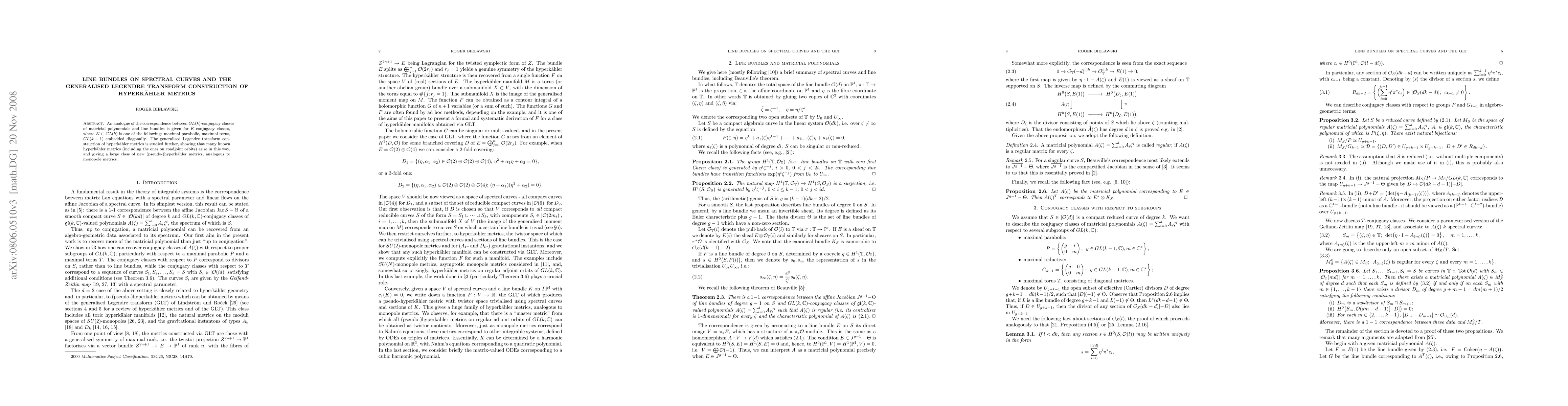 An analogue of the correspondence between GL(k)-conjugacy classes of matricial polynomials and line bundles is given for K-conjugacy classes, where K is one of the following: maximal parabolic, maximal torus, GL(k-1) embedded diagonally. The generalised Legendre transform construction of hyperkaehler metrics is studied further, showing that many known hyperkaehler metrics (including the ones on coadjoint orbits) arise in this way, and giving a large class of new (pseudo-)hyperkaehler metrics, analogous to monopole metrics.