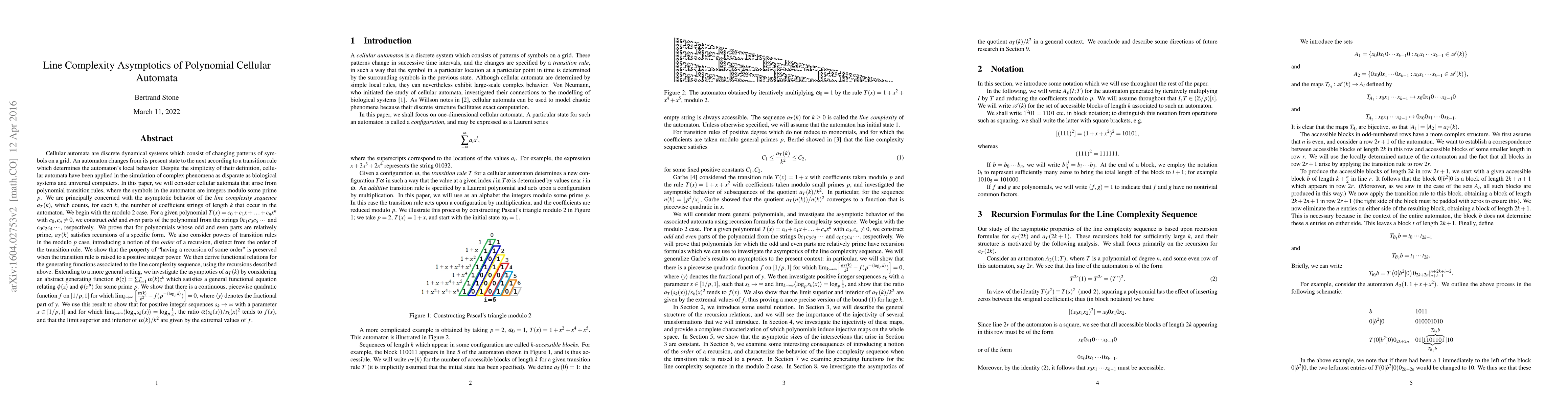 Cellular automata are discrete dynamical systems that consist of patterns of symbols on a grid, which change according to a locally determined transition rule. In this paper, we will consider cellular automata that arise from polynomial transition rules, where the symbols in the automaton are integers modulo some prime $p$. We are principally concerned with the asymptotic behavior of the line complexity sequence $a_T(k)$, which counts, for each $k$, the number of coefficient strings of length $k$ that occur in the automaton. We begin with the modulo $2$ case. For a given polynomial $T(x) = c_0 + c_1x + ... + c_nx^n$ with $c_0,c_n\neq 0$, we construct odd and even parts of the polynomial from the strings $0c_1c_3c_5...$ and $c_0c_2c_4...$, respectively. We prove that for polynomials for which the odd and even parts are relatively prime, $a_T(k)$ satisfies recursions of a specific form. We also consider powers of transition rules modulo $p$, introducing a notion of the order of a recursion. We show that the property of "having a recursion of some order" is preserved when the transition rule is raised to a positive integer power. Extending to a more general setting, we investigate the asymptotics of $a_T(k)$ by considering an abstract generating function $\phi(z)=\sum_{k=1}^\infty\alpha(k)z^k$ which satisfies a general functional equation relating $\phi(z)$ and $\phi(z^p)$ for some prime $p$. We show that there is a continuous, piecewise quadratic function $f$ on $[1/p, 1]$ for which $\lim_{k\to\infty}(\alpha(k)/k^2 - f(p^{-\langle\log_p k\rangle})) = 0$, where $\langle y\rangle$ denotes the fractional part of $y$. We use this result to show that for certain positive integer sequences $s_k\to\infty$ with a parameter $x\in [1/p,1]$, the ratio $\alpha(s_k(x))/s_k(x)^2$ tends to $f(x)$, and that the limit superior and inferior of $\alpha(k)/k^2$ are given by the extremal values of $f$.