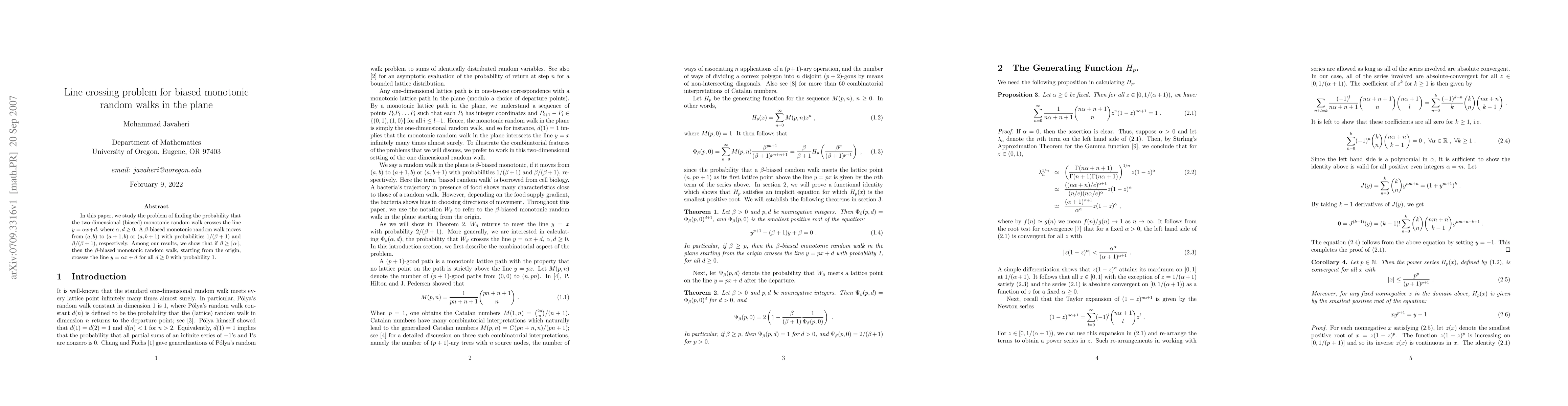 In this paper, we study the problem of finding the probability that the two-dimensional (biased) monotonic random walk crosses the line $y=\alpha x+d$, where $\alpha,d \geq 0$. A $\beta$-biased monotonic random walk moves from $(a,b)$ to $(a+1,b)$ or $(a,b+1)$ with probabilities $1/(\beta + 1)$ and $\beta/(\beta + 1)$, respectively. Among our results, we show that if $\beta \geq \lceil \alpha \rceil$, then the $\beta$-biased monotonic random walk, starting from the origin, crosses the line $y=\alpha x+d$ for all $d\geq 0$ with probability 1.