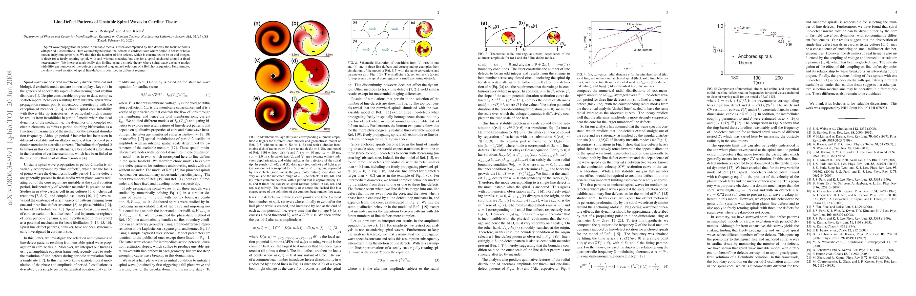 This paper investigates the line-defect patterns of unstable spiral waves in cardiac tissue, finding that freely rotating spirals have three line defects while anchored spirals have one. The authors use a theoretical model based on a Helmholtz equation to explain these findings and describe the rotation dynamics of spiral line-defects.