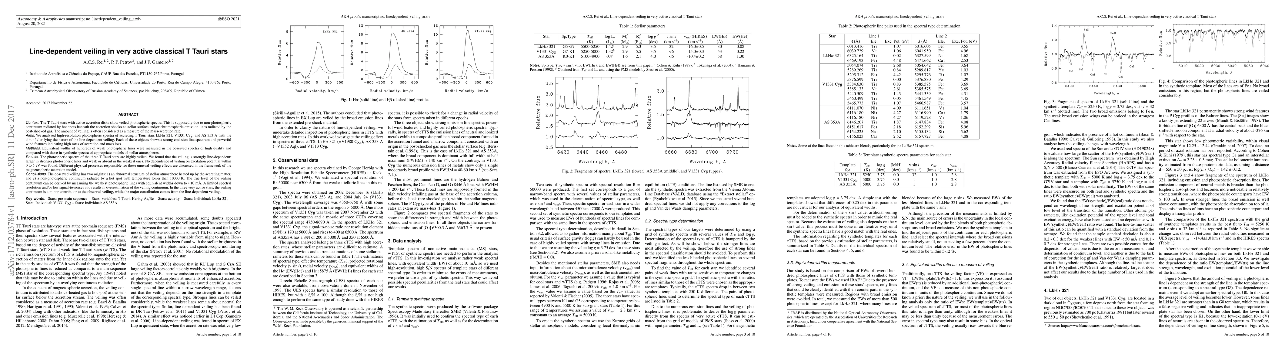 The T Tauri stars with active accretion disks show veiled photospheric spectra. This is supposedly due to non-photospheric continuum radiated by hot spots beneath the accretion shocks at stellar surface and/or chromospheric emission lines radiated by the post-shocked gas. The amount of veiling is often considered as a measure of the mass-accretion rate. We analysed high-resolution photospheric spectra of accreting T Tauri stars LkHa 321, V1331 Cyg, and AS 353 A with the aim of clarifying the nature of the line-dependent veiling. Each of these objects shows a highly veiled, strong emission line spectrum and powerful wind features indicating high rates of accretion and mass loss. Equivalent widths of hundreds of weak photospheric lines were measured in the observed spectra and compared with those in synthetic spectra with the same spectral type. We found that the veiling is strongly line-dependent: larger in stronger photospheric lines and weak or absent in the weakest ones. No dependence of veiling on excitation potential within 0 to 5 eV was found. Different physical processes responsible for these unusual veiling effects are discussed in the framework of the magnetospheric accretion model. The observed veiling has two origins: 1) an abnormal structure of stellar atmosphere heated up by the accreting matter, and 2) a non-photospheric continuum radiated by a hot spot with temperature lower than 10000 K. The true level of the veiling continuum can be derived by measuring the weakest photospheric lines with equivalent widths down to $\approx$10 m\AA. A limited spectral resolution and/or low signal-to-noise ratio results in overestimation of the veiling continuum. In the three very active stars, the veiling continuum is a minor contributor to the observed veiling, while the major contribution comes from the line-dependent veiling.
