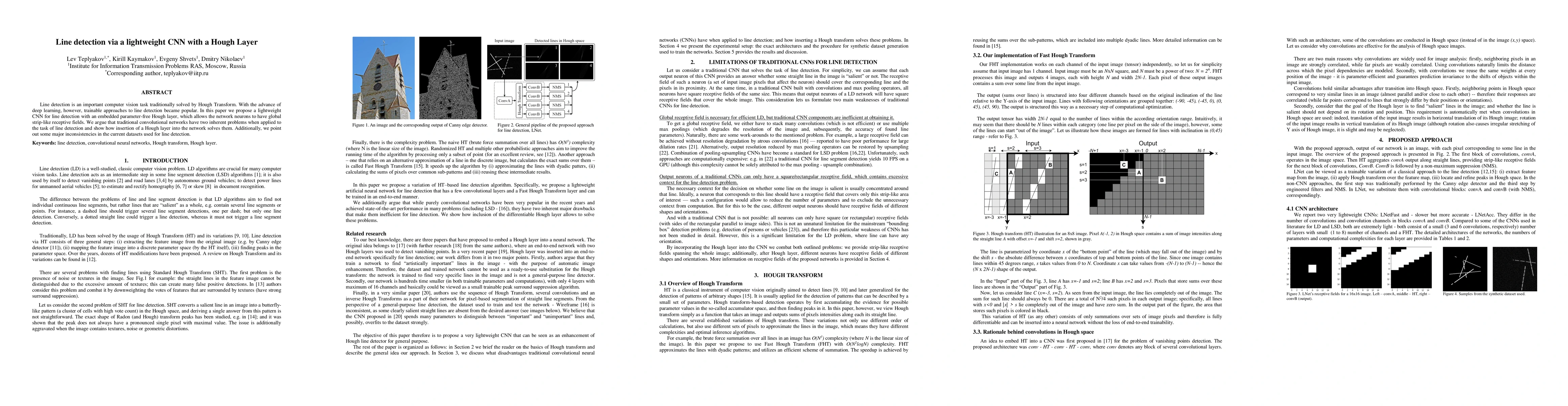 This paper proposes a lightweight CNN for line detection that incorporates a parameter-free Hough layer to address the inherent limitations of traditional CNNs in detecting lines. The Hough layer provides global strip-like receptive fields, enhancing the network's ability to detect lines while also addressing issues in existing datasets used for line detection.