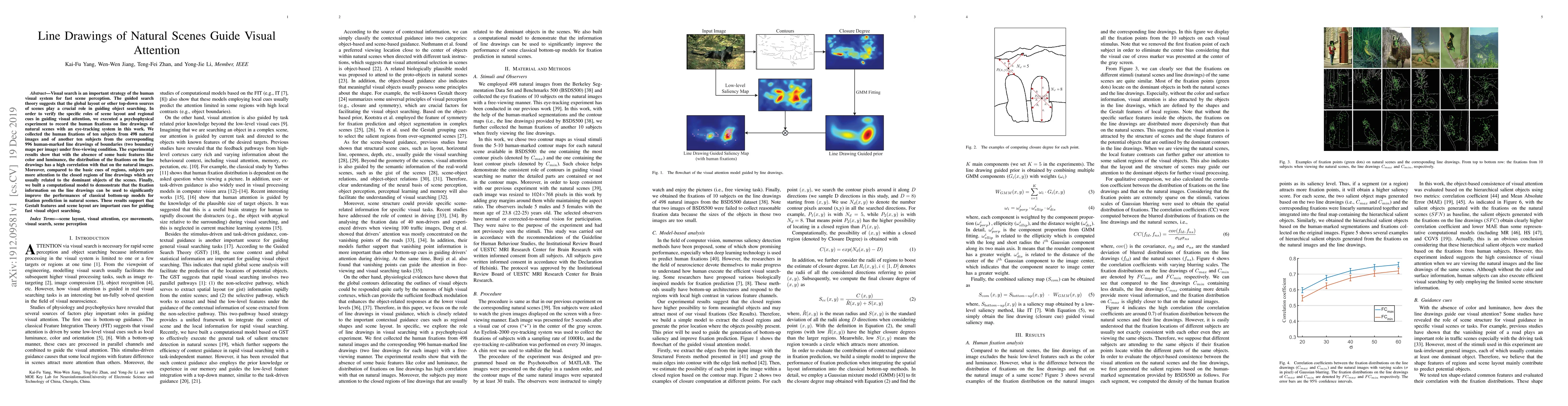 This study investigates the role of scene layout and regional cues in guiding visual attention using line drawings of natural scenes. Results show that fixations on line drawings correlate strongly with those on natural images, indicating that Gestalt features and scene layout are crucial for fast visual object searching.