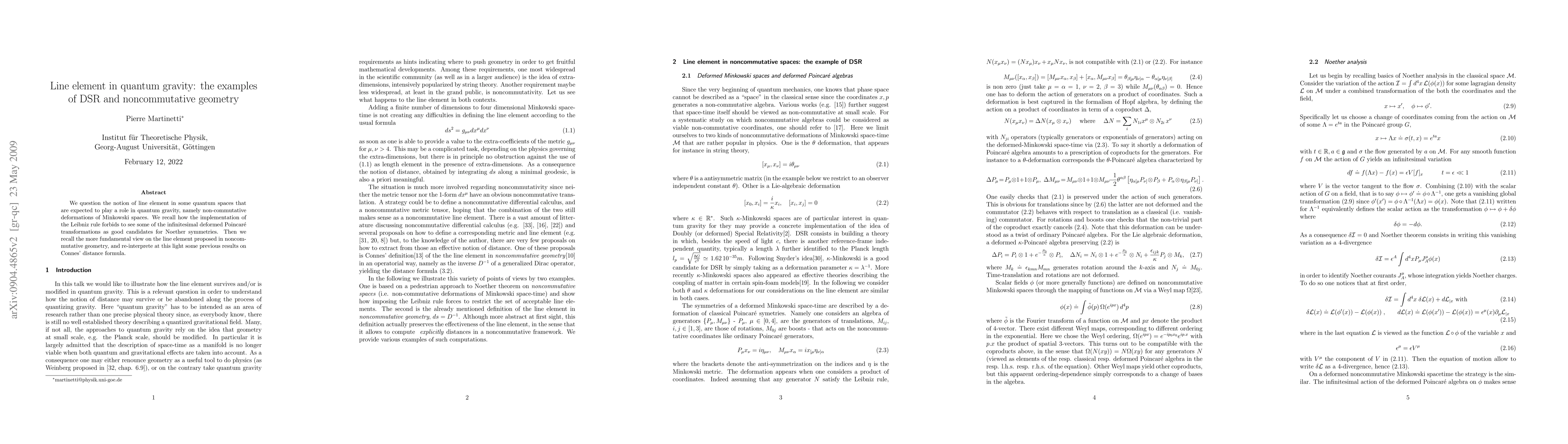 This paper examines the concept of line element in quantum gravity, focusing on non-commutative deformations of Minkowski spaces. It discusses how the Leibniz rule complicates the identification of infinitesimal deformed Poincaré transformations as Noether symmetries, and explores the implications of this view through the lens of noncommutative geometry.