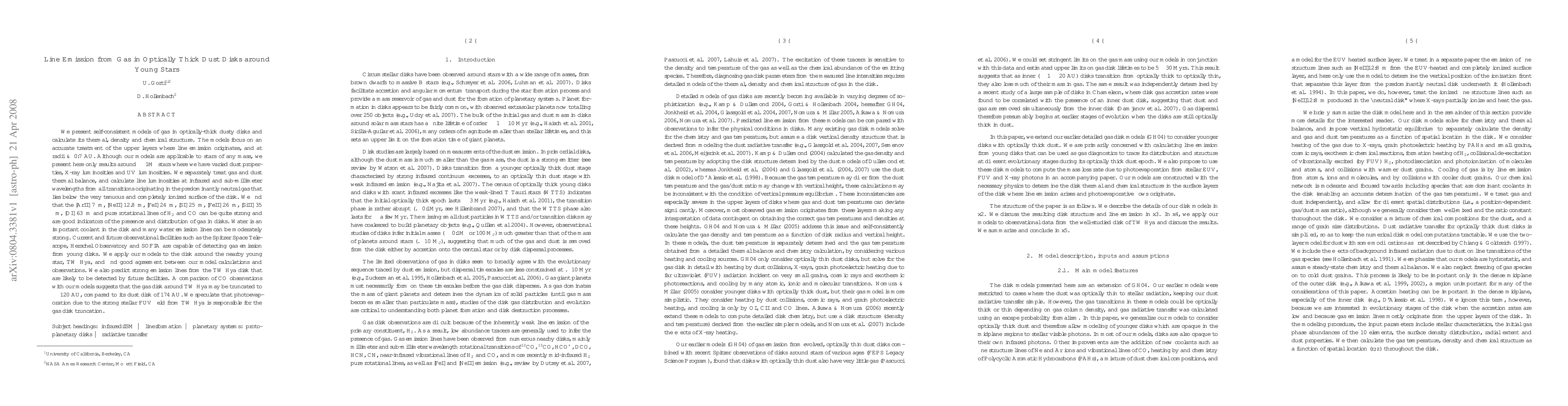 This paper models the thermal, density, and chemical structure of gas in optically-thick dusty disks around young stars, focusing on line emission origins. It finds strong emission lines from several species, indicating gas presence and distribution, and predicts detectable lines from the TW Hya disk, suggesting its gas disk may be truncated due to photoevaporation.