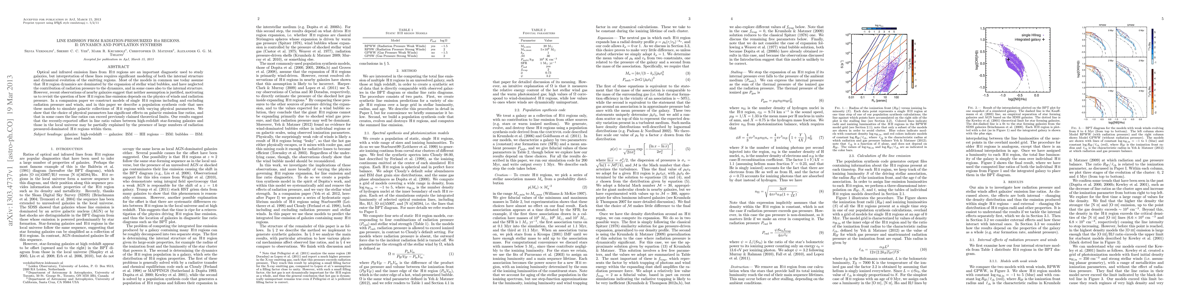 This paper develops a population synthesis code to simulate HII regions considering radiation pressure dynamics, showing that these factors significantly affect emission line ratios. It suggests that the observed discrepancy in line ratios between high-redshift and local galaxies may be due to numerous radiation-pressure dominated HII regions.