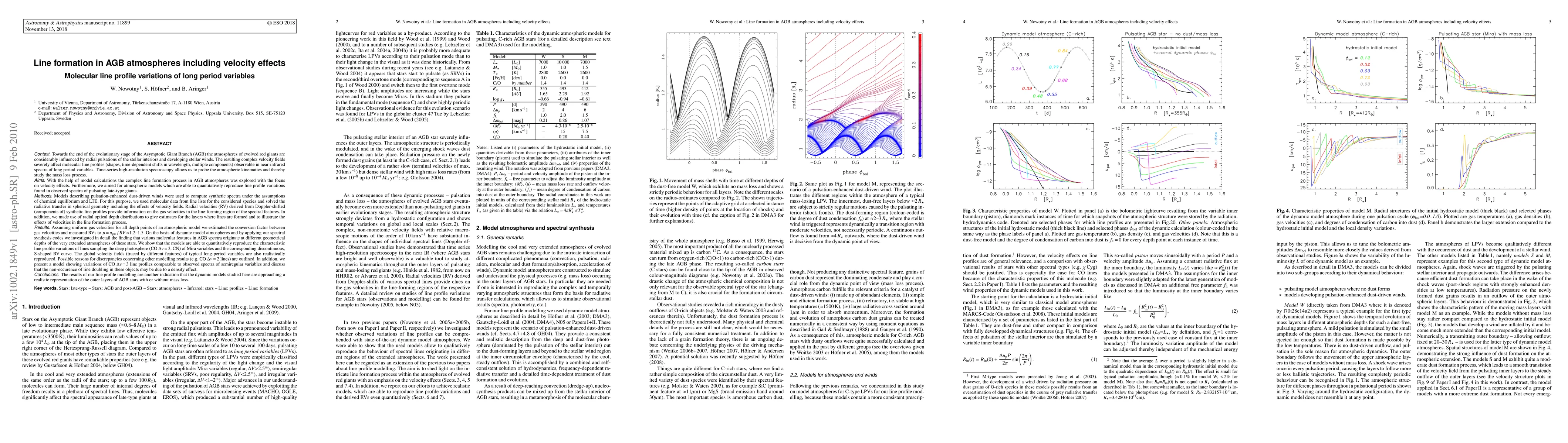 The atmospheres of evolved red giants are considerably influenced by pulsations of the stellar interiors and developing stellar winds. The resulting complex velocity fields severely affect molecular line profiles observable in NIR spectra. With the help of model calculations the complex line formation process in AGB atmospheres was explored with the focus on velocity effects. Furthermore, we aimed for atmospheric models which are able to quantitatively reproduce line profile variations found in observed spectra of pulsating late-type giants. Models describing pulsation-enhanced dust-driven winds were used to compute synthetic spectra under the assumptions of chemical equilibrium and LTE and by solving the radiative transfer in spherical geometry including velocity effects. Radial velocities derived from Doppler-shifted synthetic line profiles provide information on the gas velocities in the line-forming region of the spectral features. On the basis of dynamic models we investigated in detail the finding that various molecular features in AGB spectra originate at different geometrical depths of the very extended atmospheres. We show that the models are able to quantitatively reproduce the characteristic line profile variations of lines sampling the deep photosphere. The global velocity fields of typical LPVs are also realistically reproduced. Possible reasons for discrepancies concerning other modelling results are outlined. In addition, we present a model showing variations of CO dv=3 line profiles comparable to observed spectra of SRVs and discuss that the non-occurence of line doubling in these objects may be due to a density effect. The results of our line profile modelling are another indication that the dynamic models studied here are approaching a realistic representation of the outer layers of AGB stars.