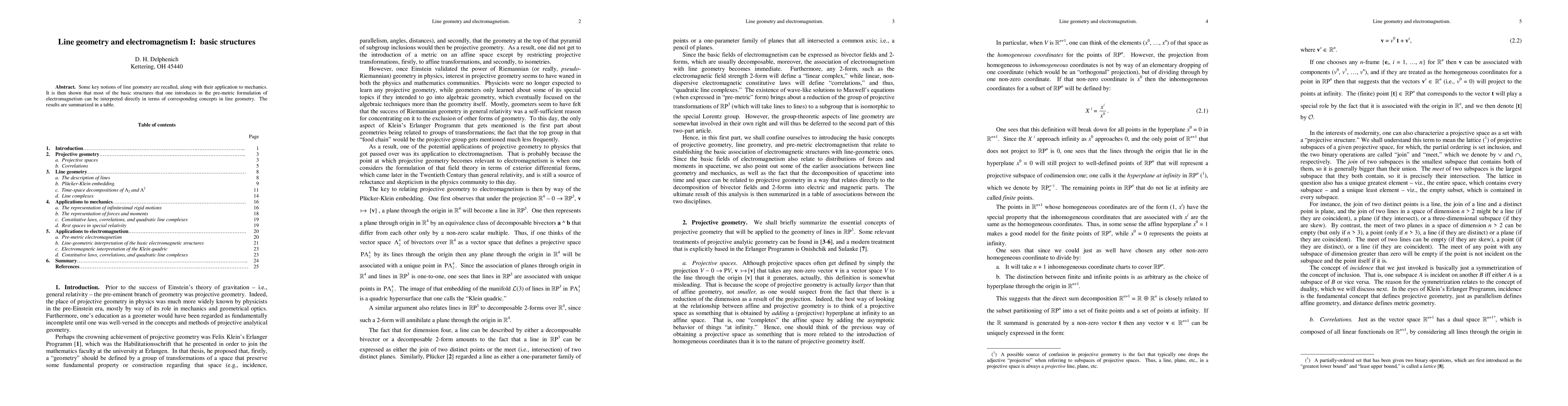 This paper reviews fundamental concepts in line geometry and demonstrates their application to mechanics, subsequently showing how these geometric ideas parallel the basic structures in electromagnetism, with a summary presented in a comparative table.