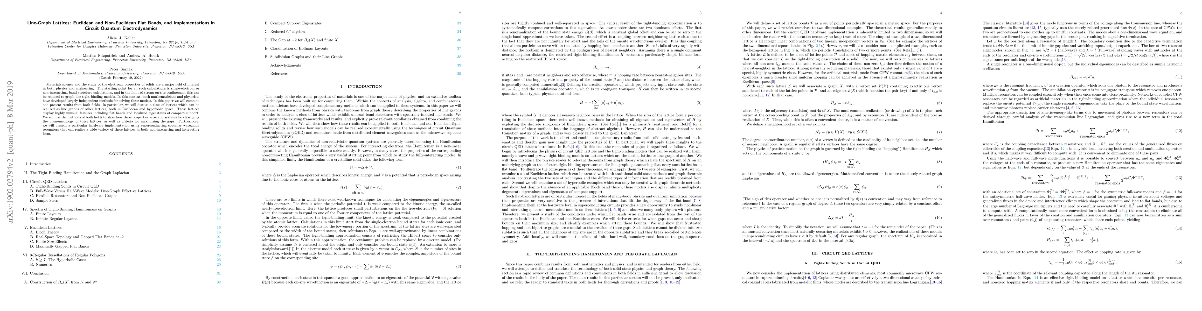 Materials science and the study of the electronic properties of solids are a major field of interest in both physics and engineering. The starting point for all such calculations is single-electron, or non-interacting, band structure calculations, and in the limit of strong on-site confinement this can be reduced to graph-like tight-binding models. In this context, both mathematicians and physicists have developed largely independent methods for solving these models. In this paper we will combine and present results from both fields. In particular, we will discuss a class of lattices which can be realized as line graphs of other lattices, both in Euclidean and hyperbolic space. These lattices display highly unusual features including flat bands and localized eigenstates of compact support. We will use the methods of both fields to show how these properties arise and systems for classifying the phenomenology of these lattices, as well as criteria for maximizing the gaps. Furthermore, we will present a particular hardware implementation using superconducting coplanar waveguide resonators that can realize a wide variety of these lattices in both non-interacting and interacting form.