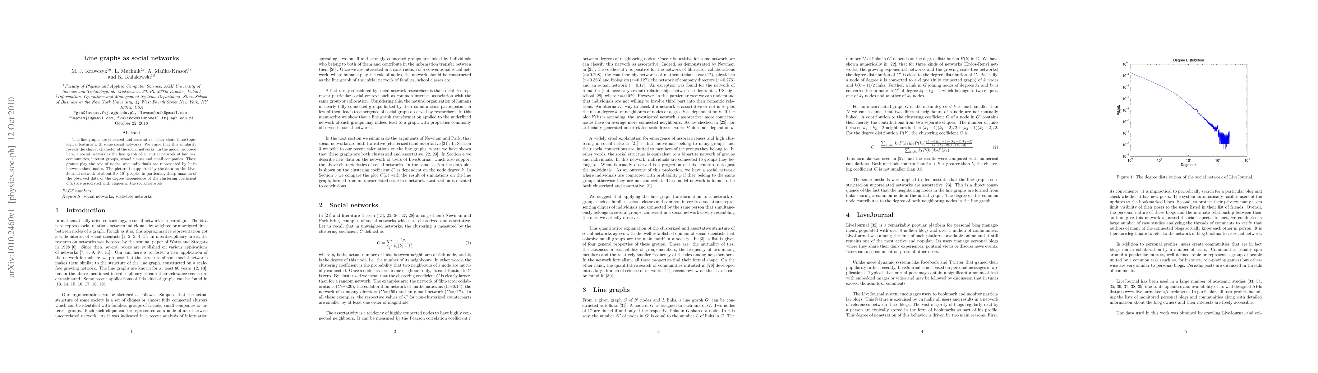 This paper proposes that line graphs can model social networks due to their shared topological features, like clustering and assortativity, which reflect the cliquey nature of social interactions. Data from the LiveJournal network supports the model, showing that clustering coefficients peak where cliques are present.
