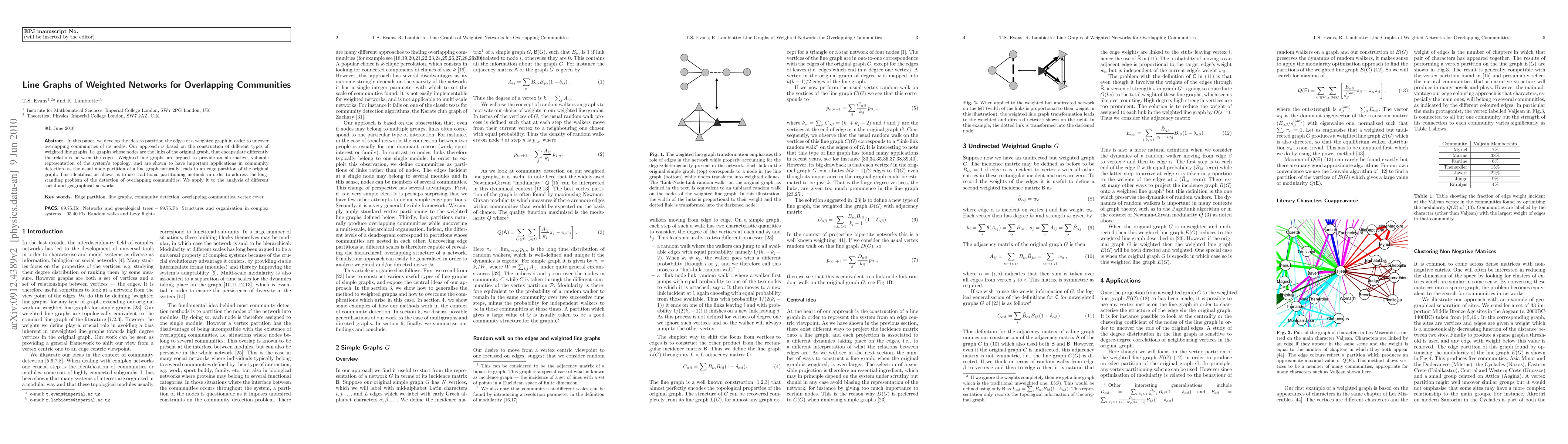 This paper proposes using weighted line graphs to detect overlapping communities in networks by partitioning graph edges. This method provides an alternative topological representation that facilitates the identification of node communities through traditional partitioning methods.