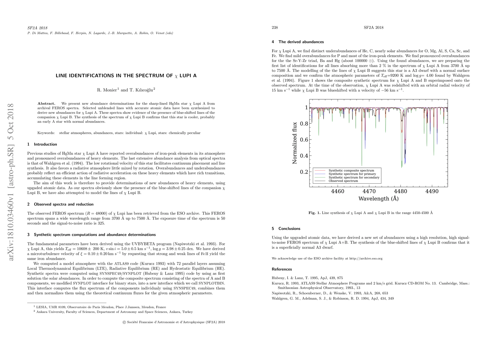 We present new abundance determinations for the sharp-lined HgMn star \chi{} Lupi A from archival FEROS spectra. Selected unblended lines with accurate atomic data have been synthesized to derive new abundances for \chi{} Lupi A. These spectra show evidence of the presence of blue-shifted lines of the companion \chi{} Lupi B. The synthesis of the spectrum of \chi{} Lupi B confirms that this star is cooler, probably an early A star with normal abundances.