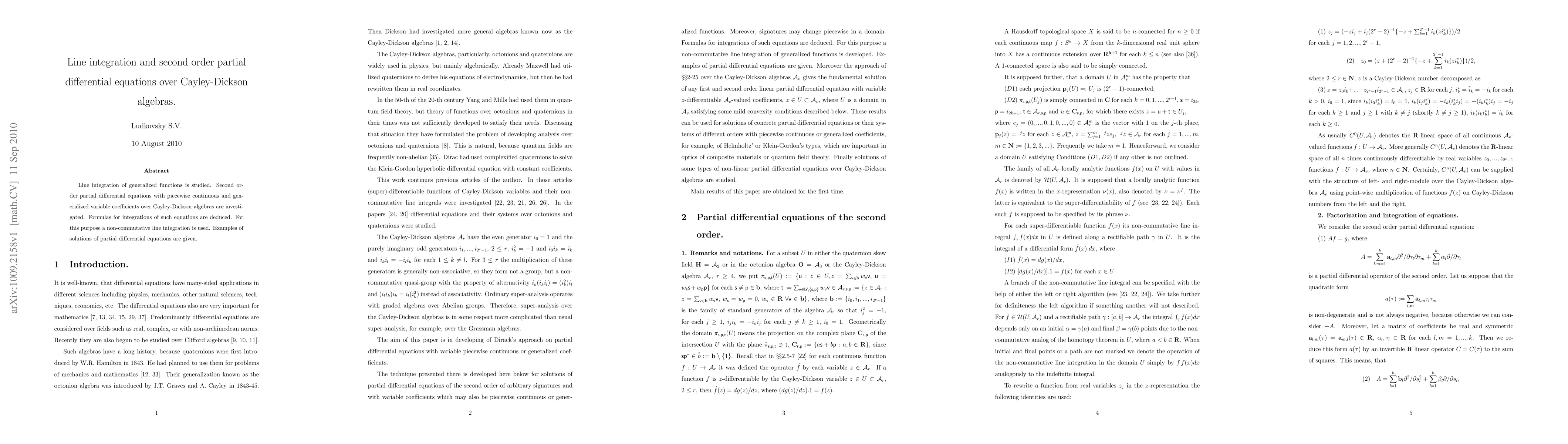 This paper explores line integration of generalized functions and investigates second-order partial differential equations over Cayley-Dickson algebras with piecewise continuous and generalized variable coefficients. It deduces integration formulas using non-commutative line integration and provides examples of solutions to these equations.