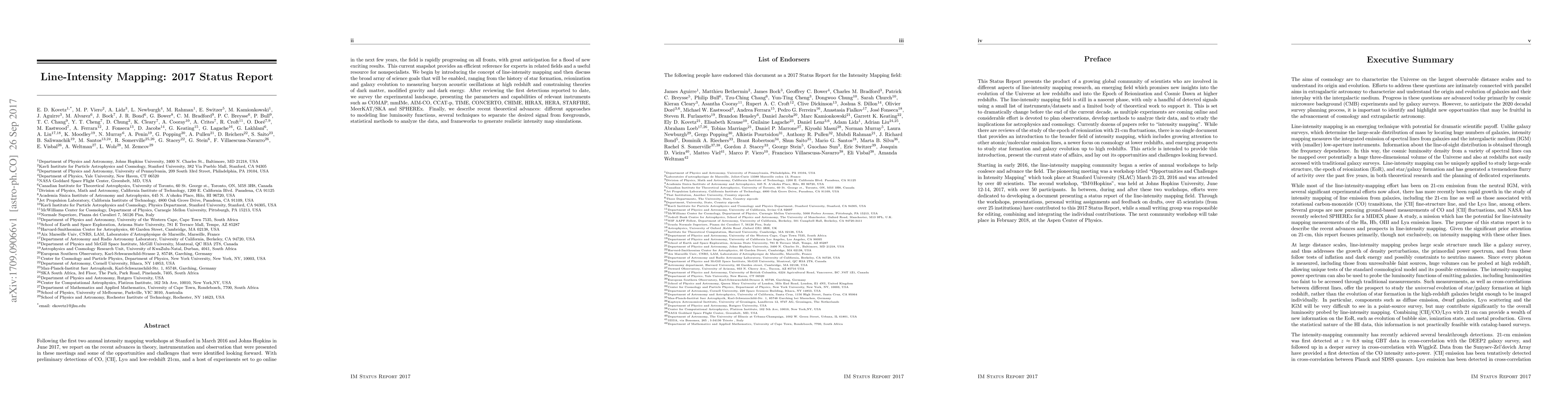 This paper provides a comprehensive 2017 status report on line-intensity mapping, detailing recent advances in theory, instrumentation, and observations. It highlights the preliminary detections of key astrophysical lines and discusses the upcoming experiments poised to deliver significant new results, serving as a valuable reference for both experts and nonspecialists in the field.