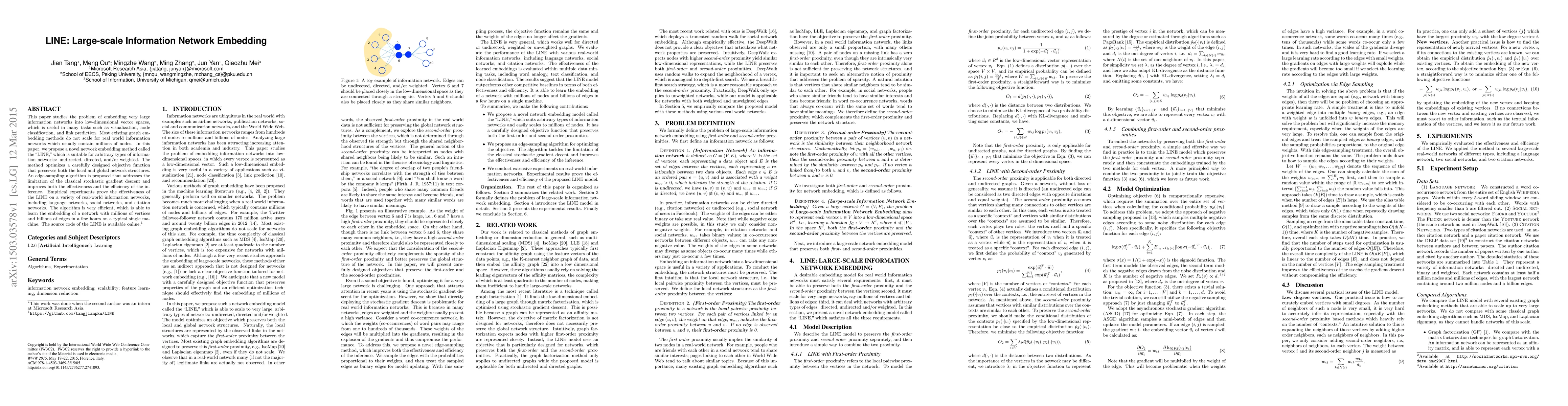 The paper proposes LINE, a network embedding method that scales to large networks with millions of nodes and billions of edges. It optimizes an objective function preserving both local and global network structures, using an edge-sampling algorithm for efficient inference.
