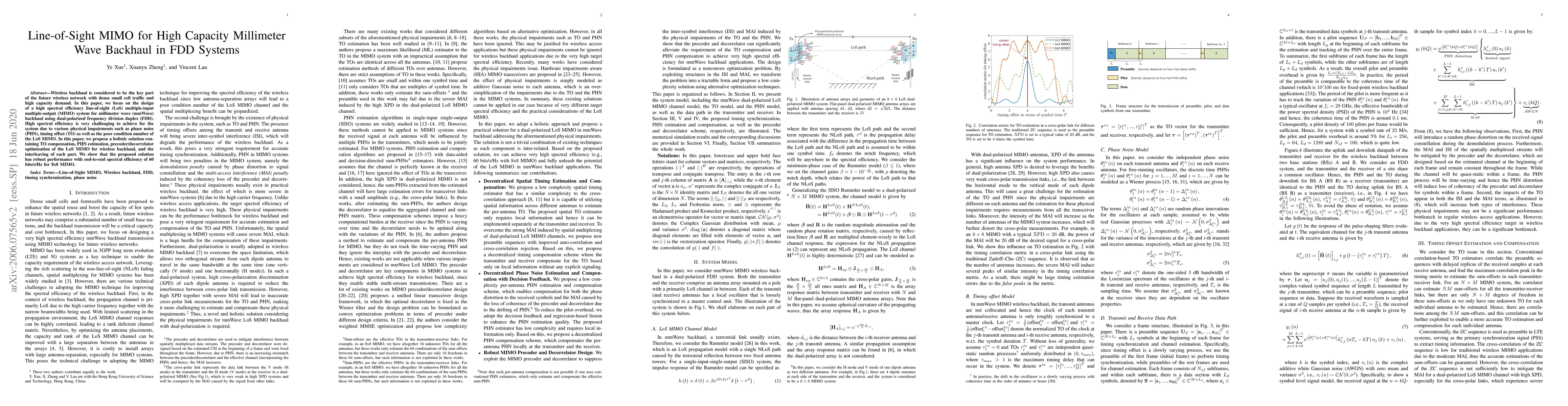 This paper proposes a line-of-sight MIMO system for high capacity millimeter wave backhaul in FDD systems, addressing physical impairments to achieve high spectral efficiency. The solution includes timing offset compensation, phase noise estimation, and optimized precoding/decorrelation, demonstrating robust performance with 60 bits/s/Hz for 8x8 MIMO.