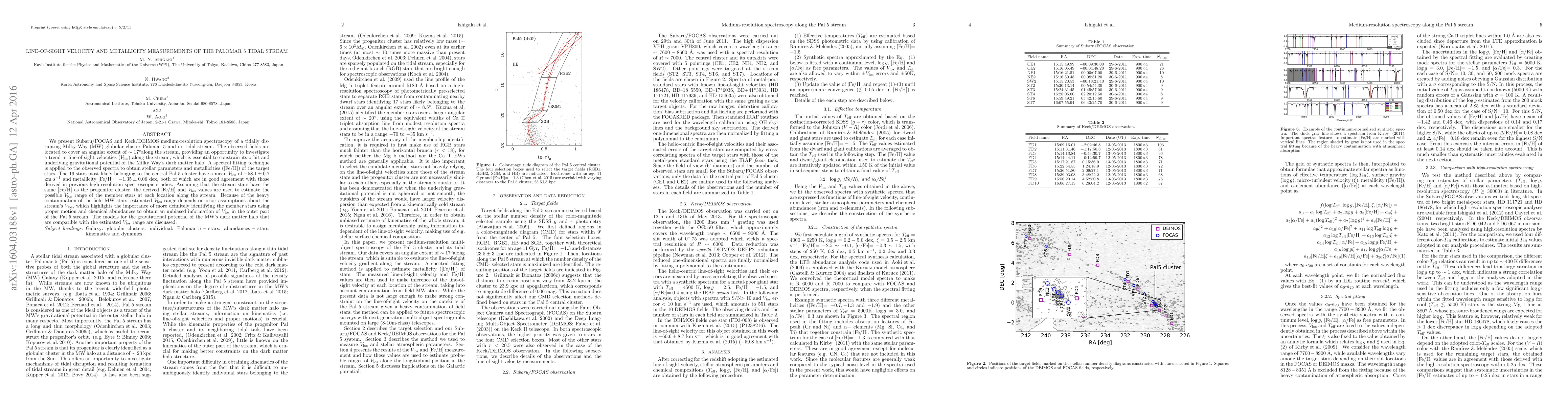 This paper uses Subaru and Keck telescopes to measure line-of-sight velocities and metallicities of stars in the Palomar 5 tidal stream, revealing a mean velocity of $-58.1\pm 0.7$ km s$^{-1}$ and metallicity [Fe/H]$=-1.35\pm 0.06$ dex, which aids in modeling the Milky Way's dark matter halo.